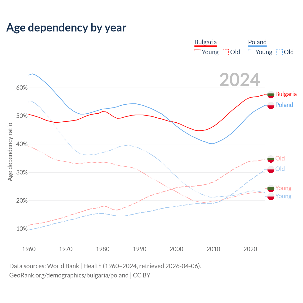 - Bulgaria is ranked 12/196 by median age (oldest to youngest) vs 30/196 for Poland.