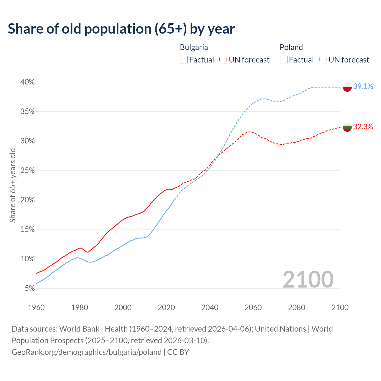 Median age Bulgaria vs Poland, 1960-2100