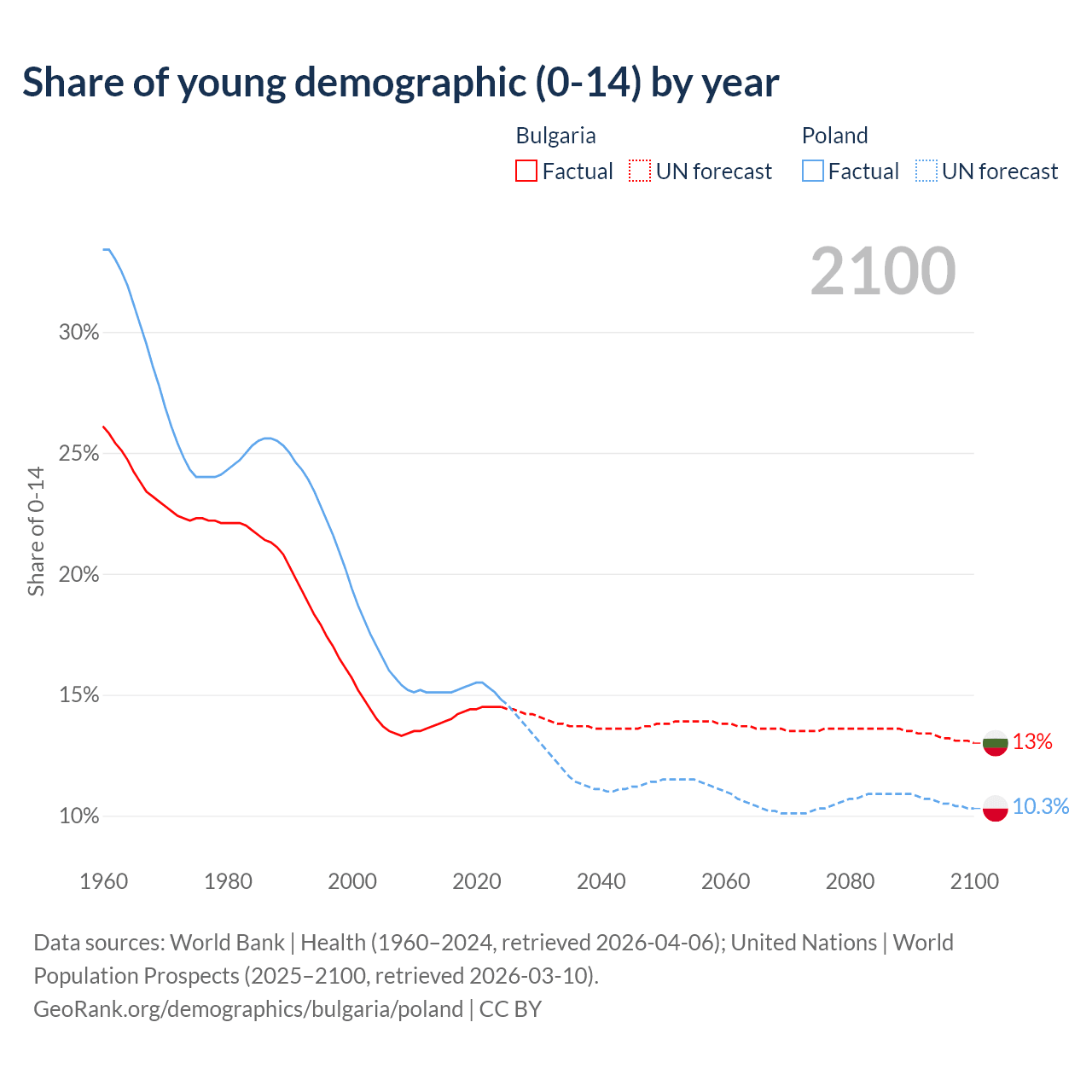 - The share of young demographic (0-15 years old) in Bulgaria is 14.5% vs 14.8% in Poland.