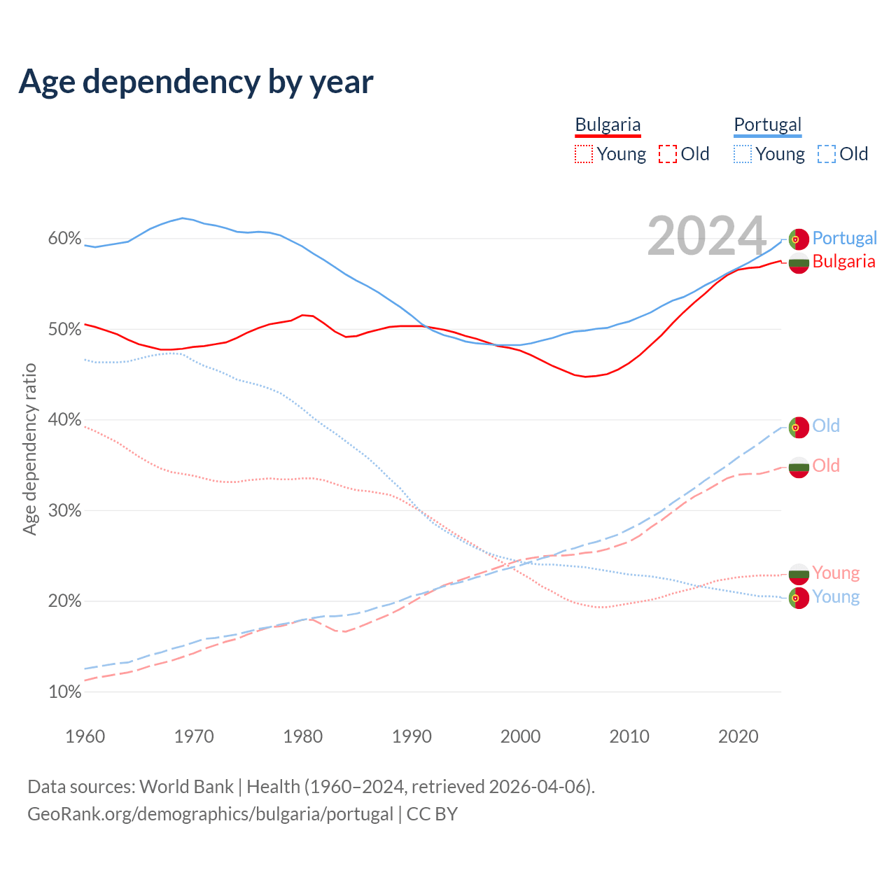 Data sources: World Bank | Health (1960–2024, retrieved 2026-04-06); U.S. Census Bureau (1960–2024, retrieved 2026-02-08).