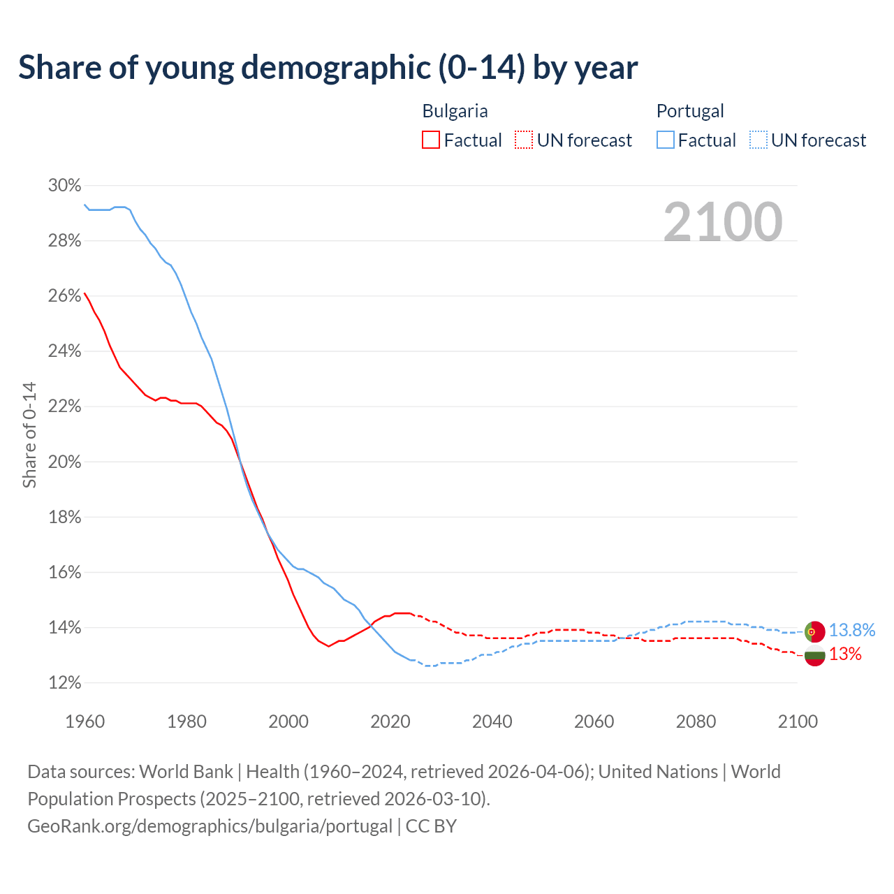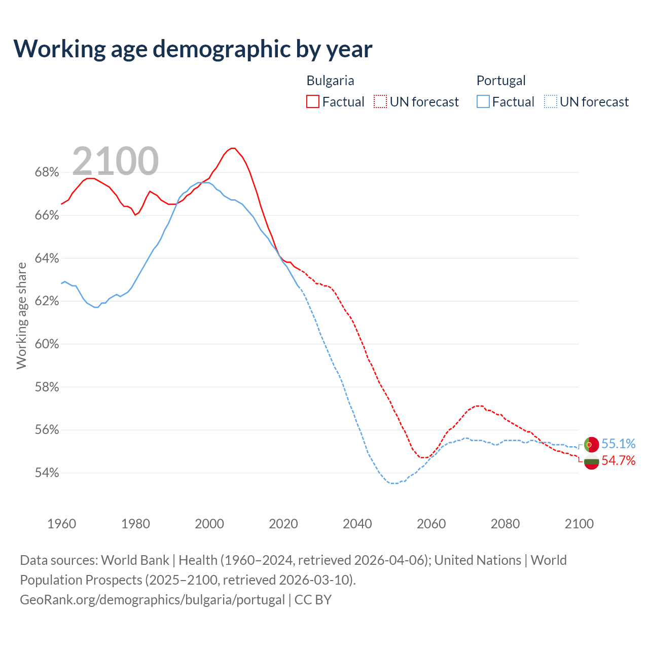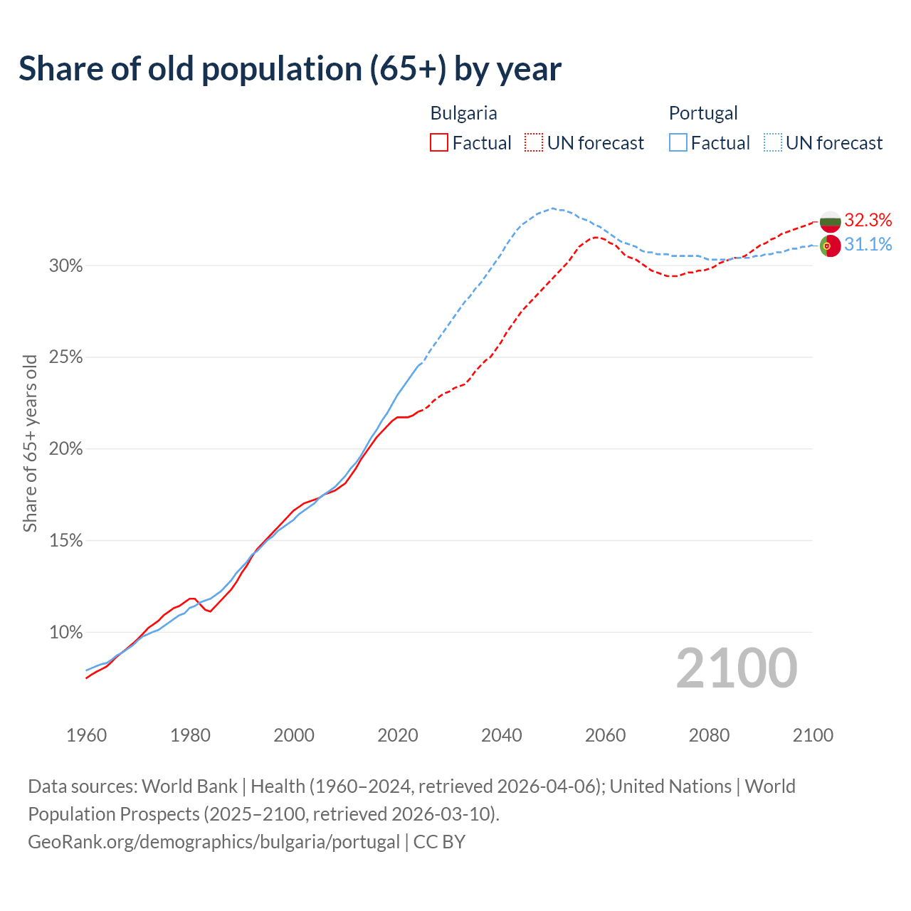 Median age Bulgaria vs Portugal, 1960-2100