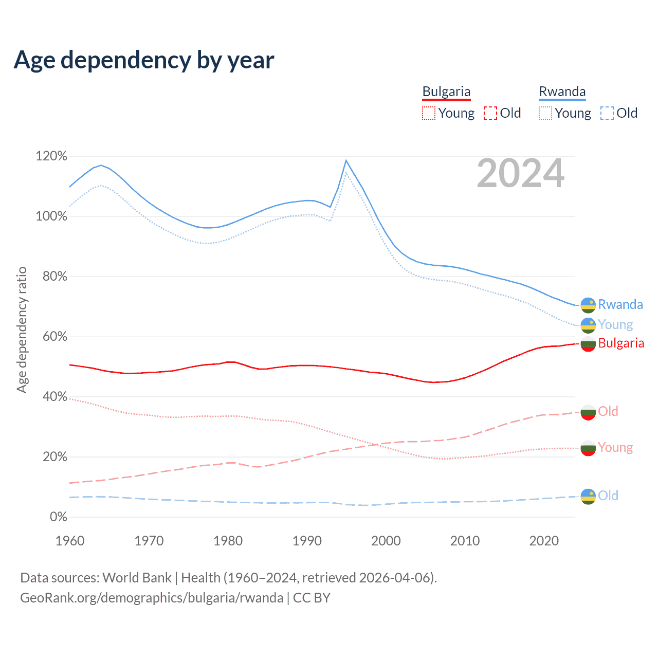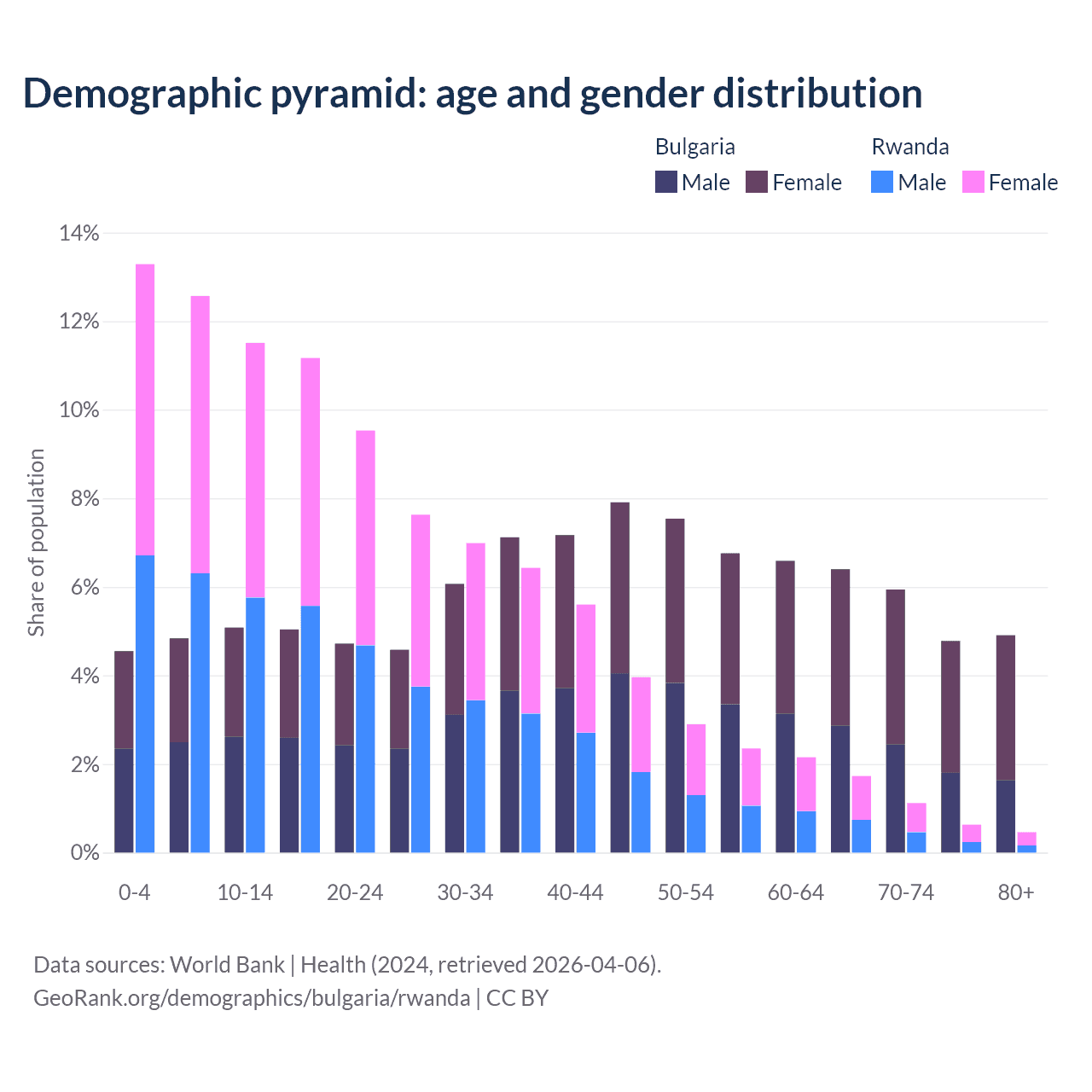 The share of older people aged 65 and over is 22% in Bulgaria and 3.93% in Rwanda. Life expectancy in Bulgaria compared to Rwanda .
