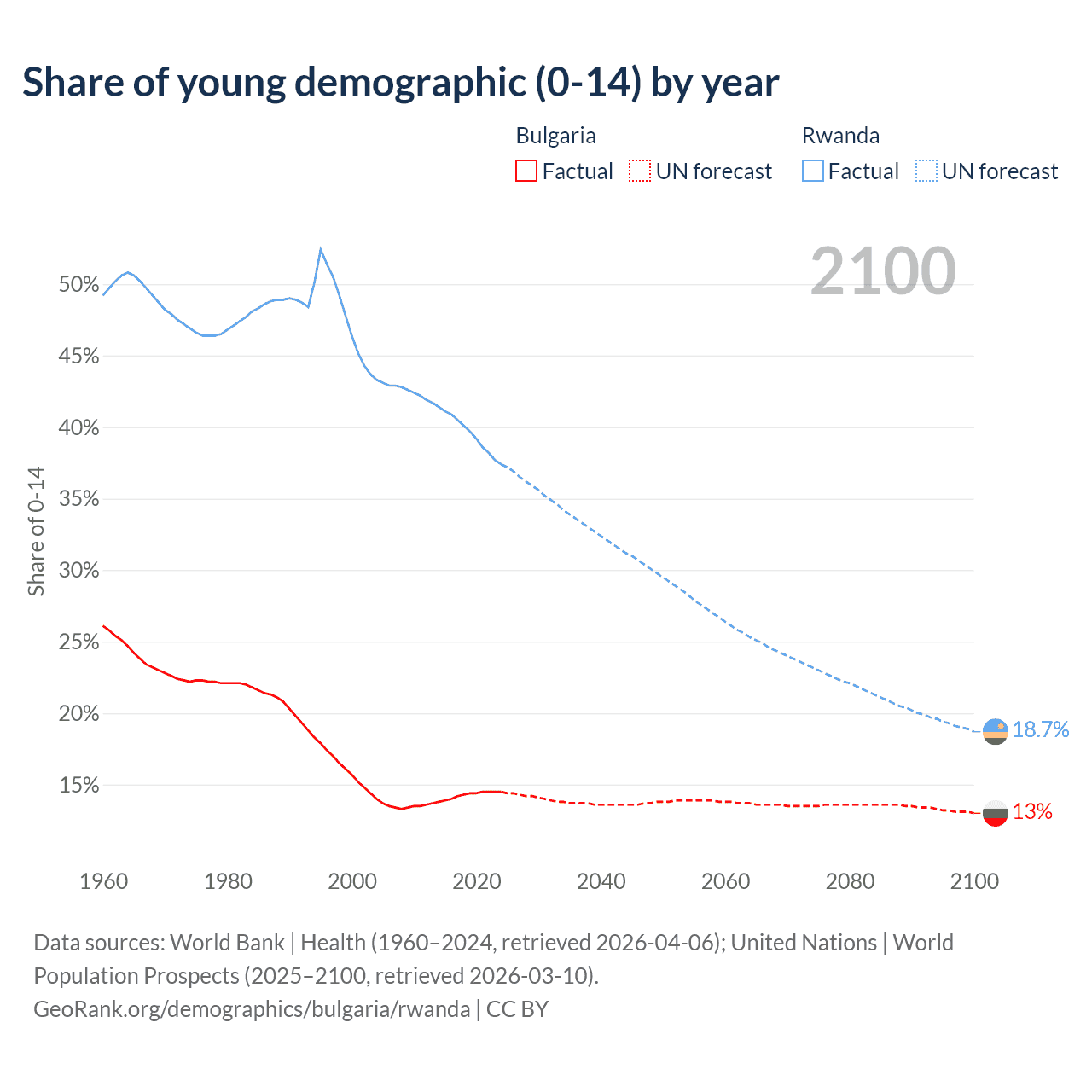 - The share of young demographic (0-15 years old) in Bulgaria is 14.5% vs 37.4% in Rwanda.