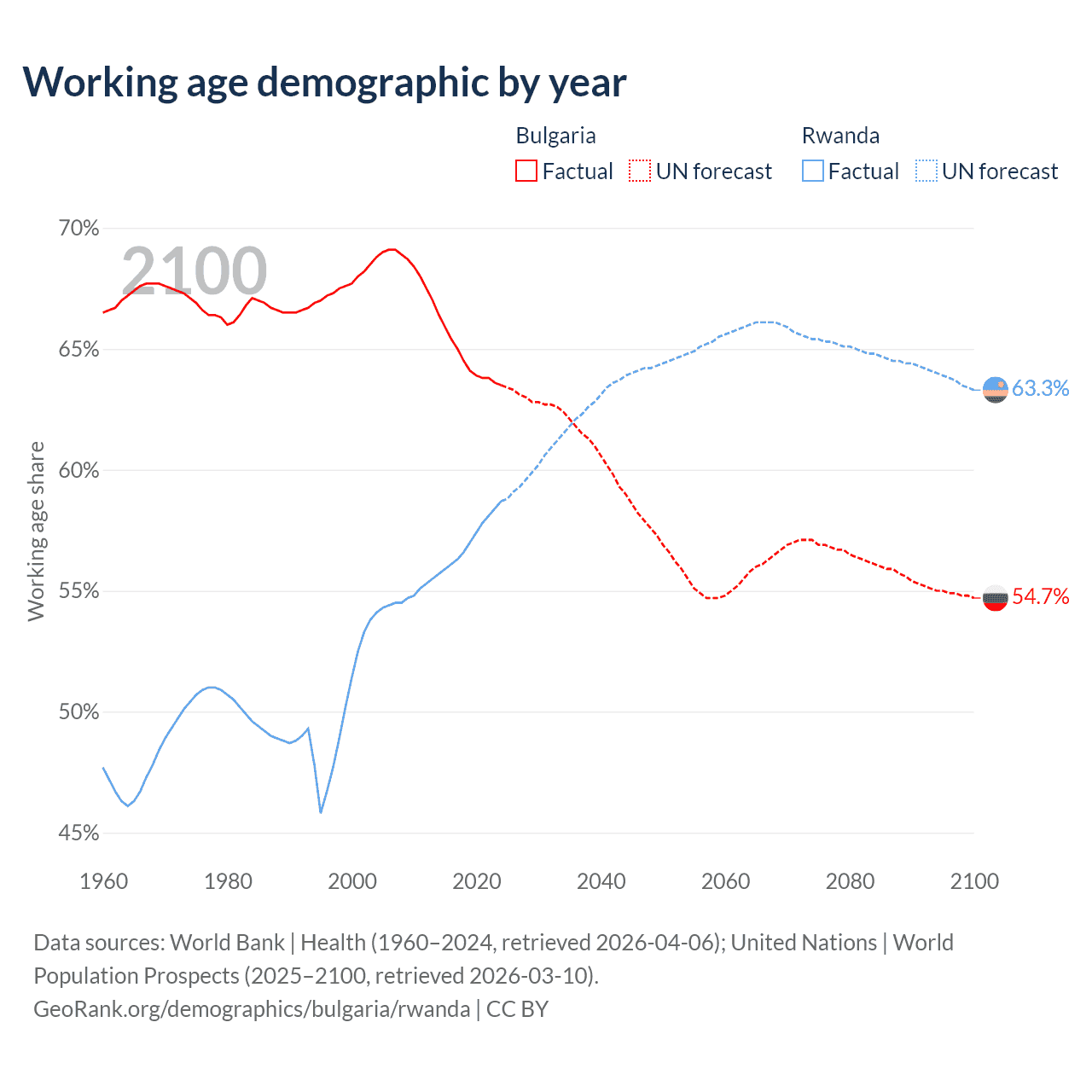 - Bulgaria has 4.04M working age adults (aged 15-64) vs 8.79M in Rwanda.