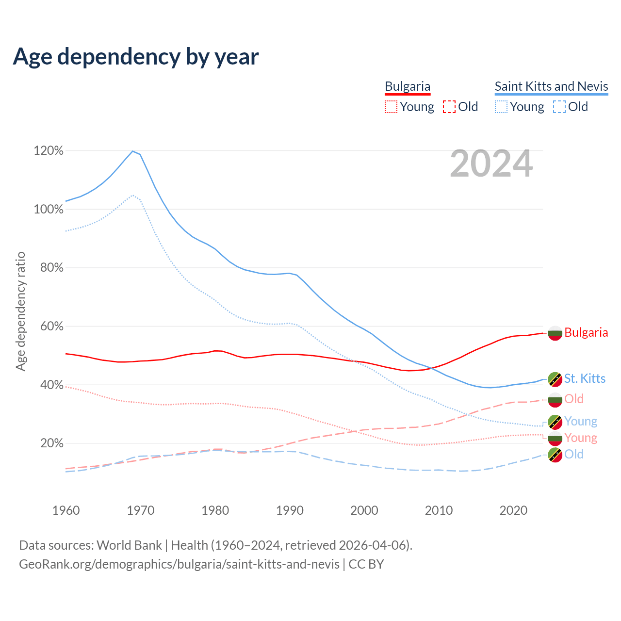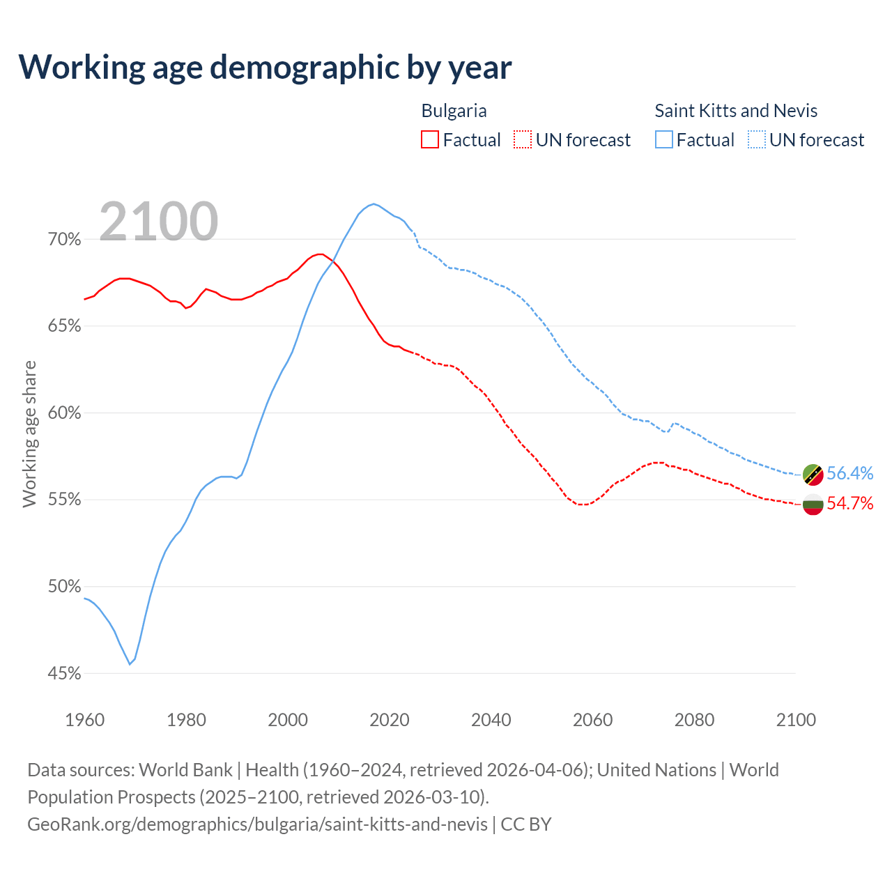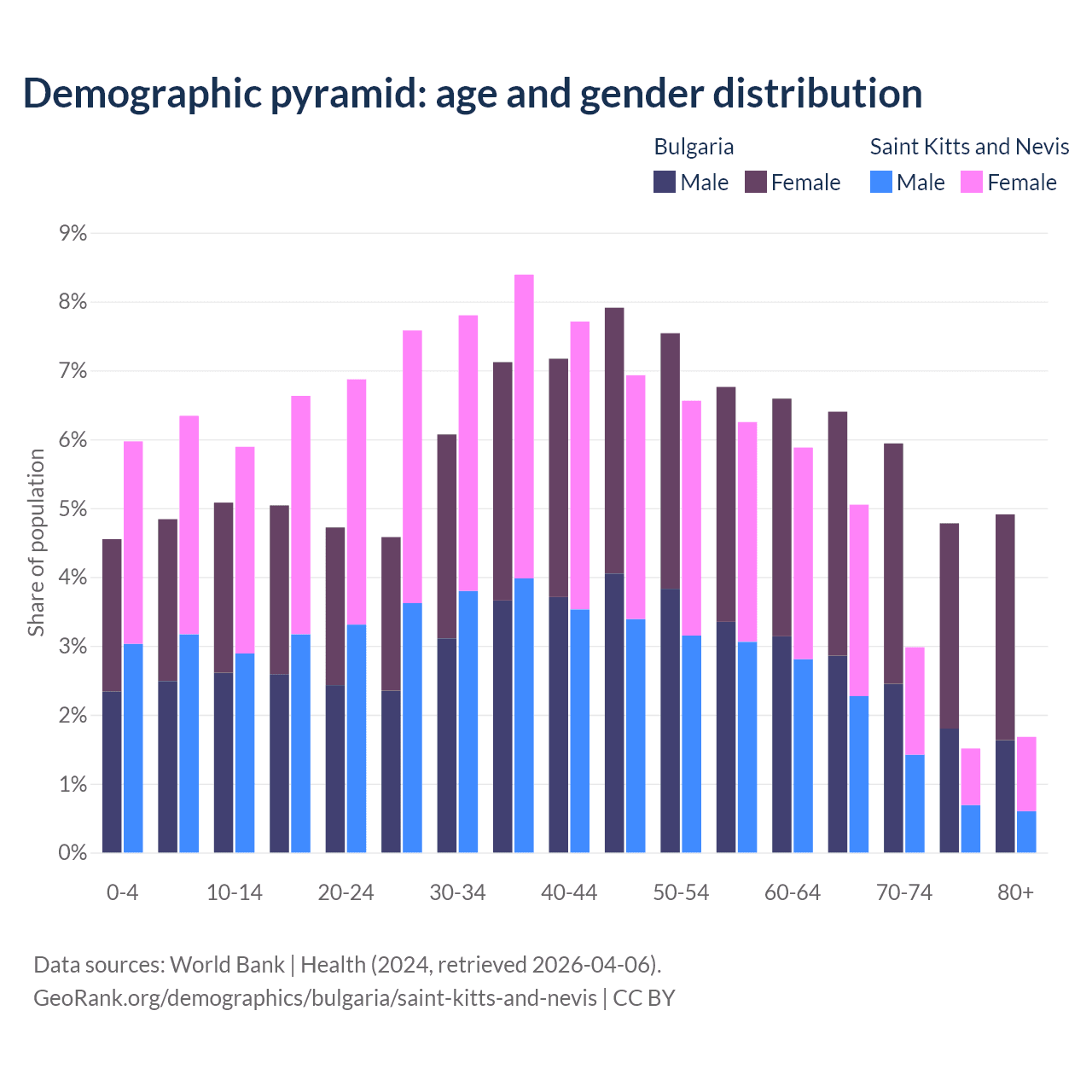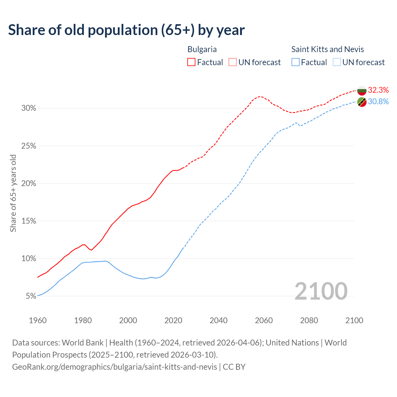 The share of older people aged 65 and over is 22% in Bulgaria and 11.2% in Saint Kitts and Nevis. Life expectancy in Bulgaria compared to Saint Kitts and Nevis .