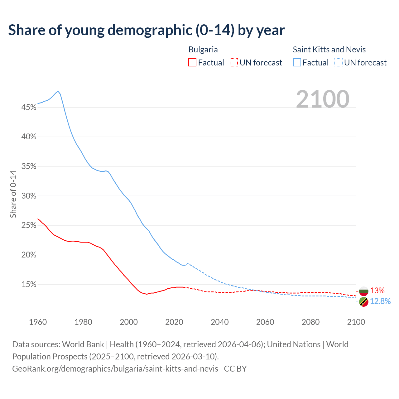 - The share of young demographic (0-15 years old) in Bulgaria is 14.5% vs 18.2% in Saint Kitts and Nevis.