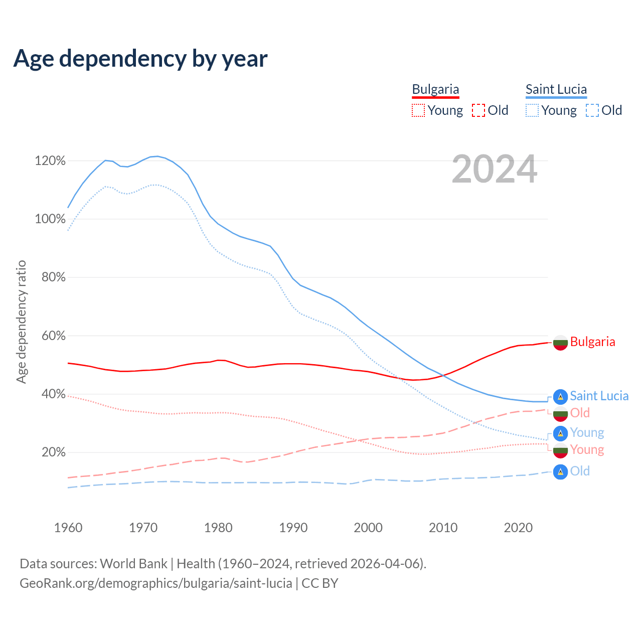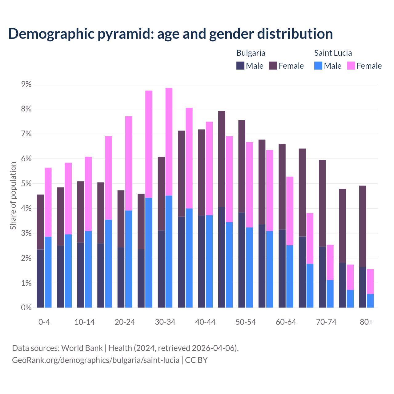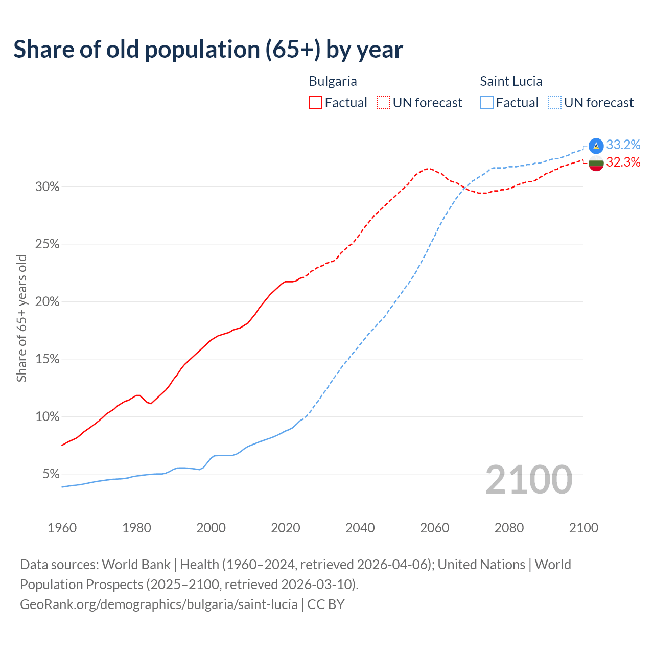 The share of older people aged 65 and over is 22% in Bulgaria and 9.62% in Saint Lucia. Life expectancy in Bulgaria compared to Saint Lucia .