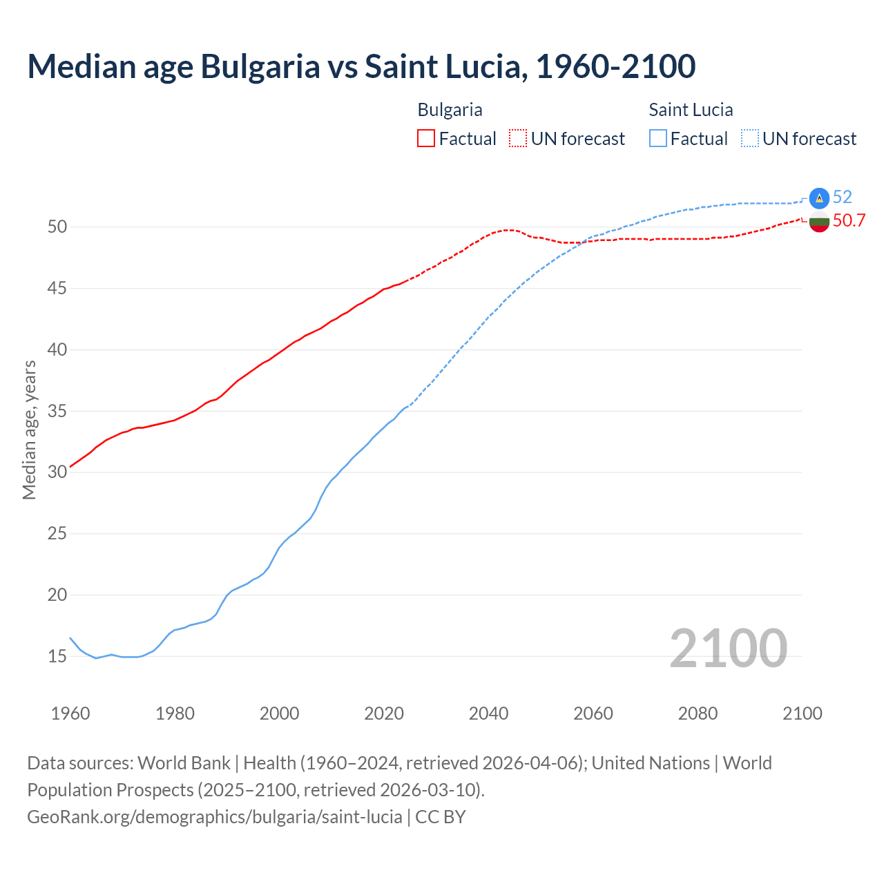 Median age Bulgaria vs Saint Lucia, 1960-2100