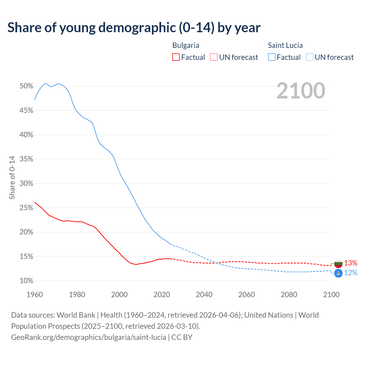 - The share of young demographic (0-15 years old) in Bulgaria is 14.5% vs 17.5% in Saint Lucia.