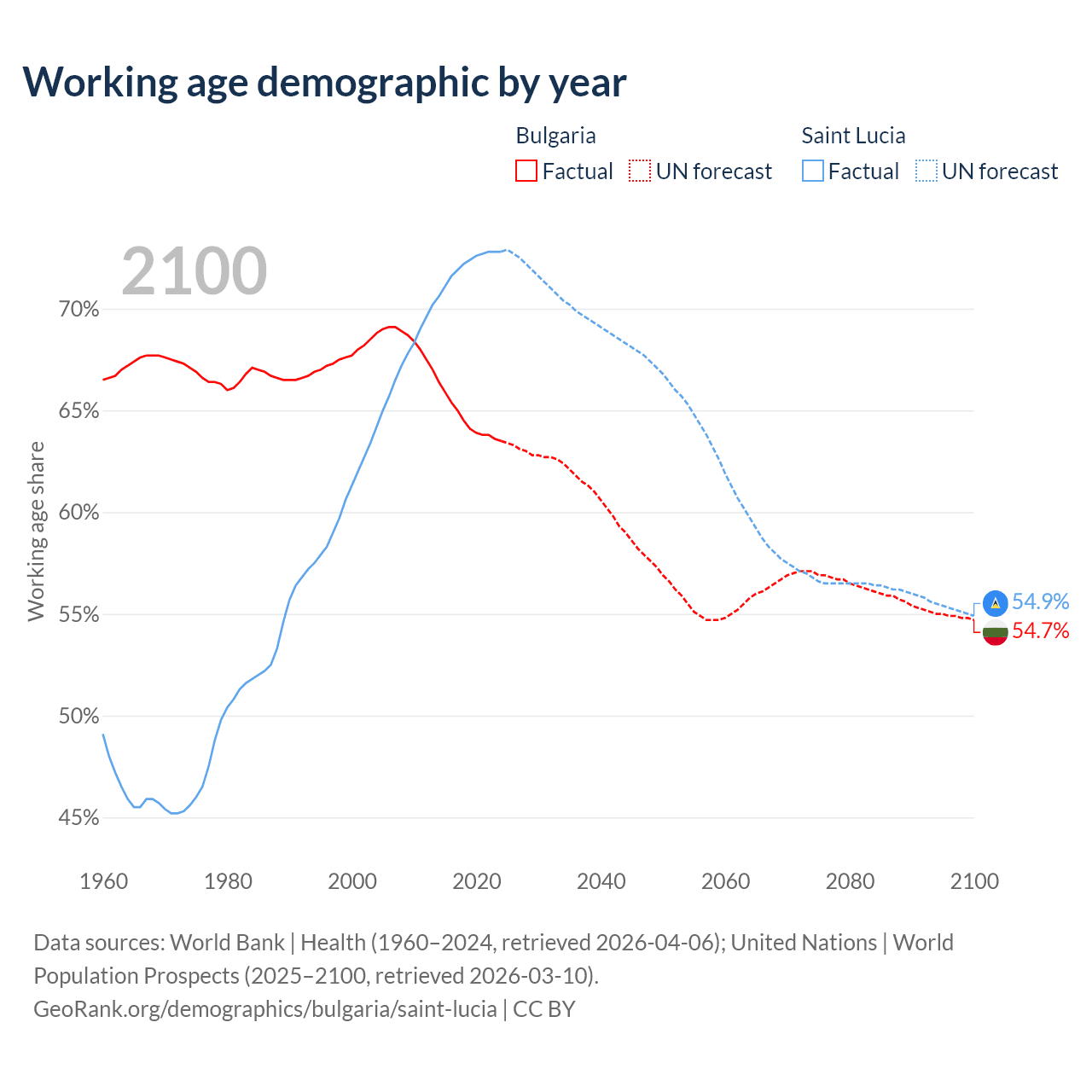 - Bulgaria has 4.04M working age adults (aged 15-64) vs 132K in Saint Lucia.