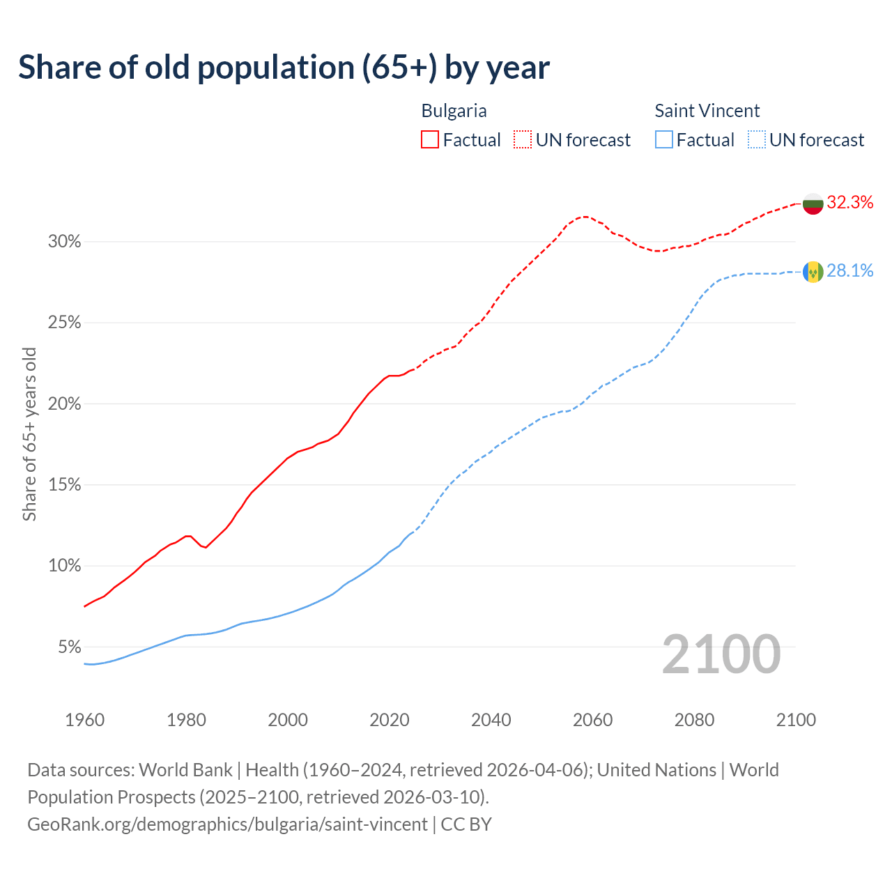 The share of older people aged 65 and over is 22% in Bulgaria and 11.9% in Saint Vincent. Life expectancy in Bulgaria compared to Saint Vincent .