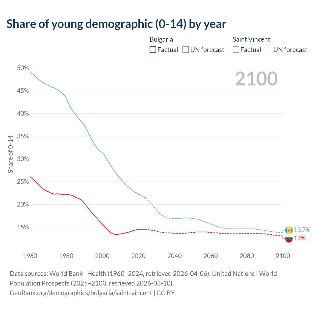 - The share of young demographic (0-15 years old) in Bulgaria is 14.5% vs 21.3% in Saint Vincent.