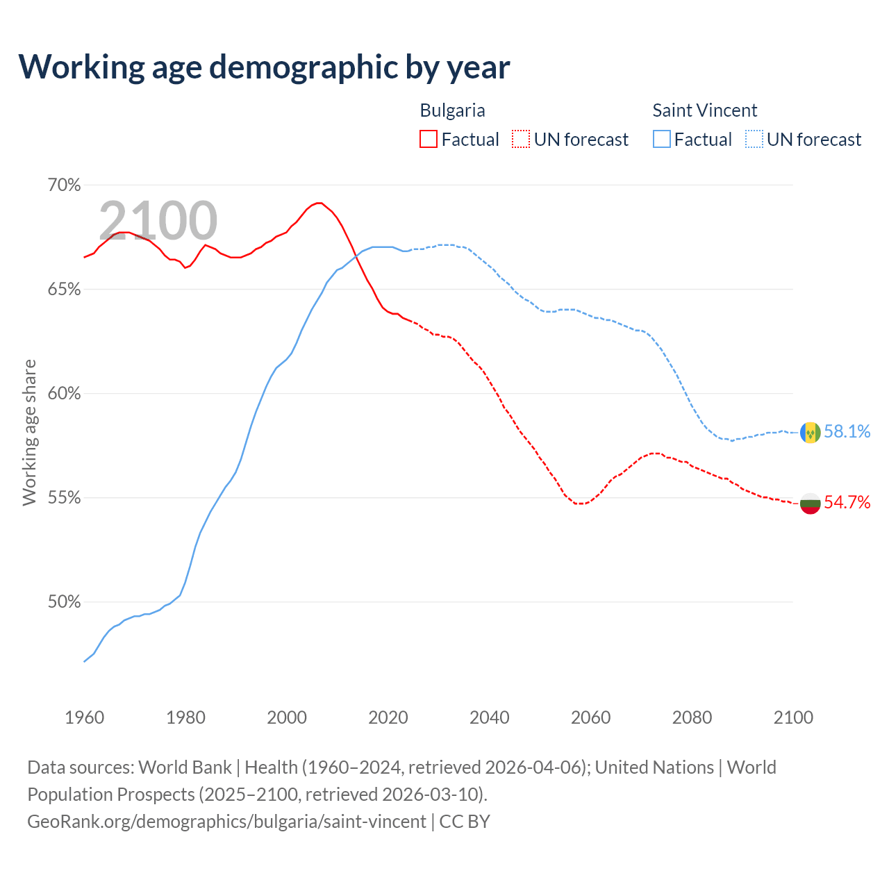 - Bulgaria has 4.04M working age adults (aged 15-64) vs 66.3K in Saint Vincent.