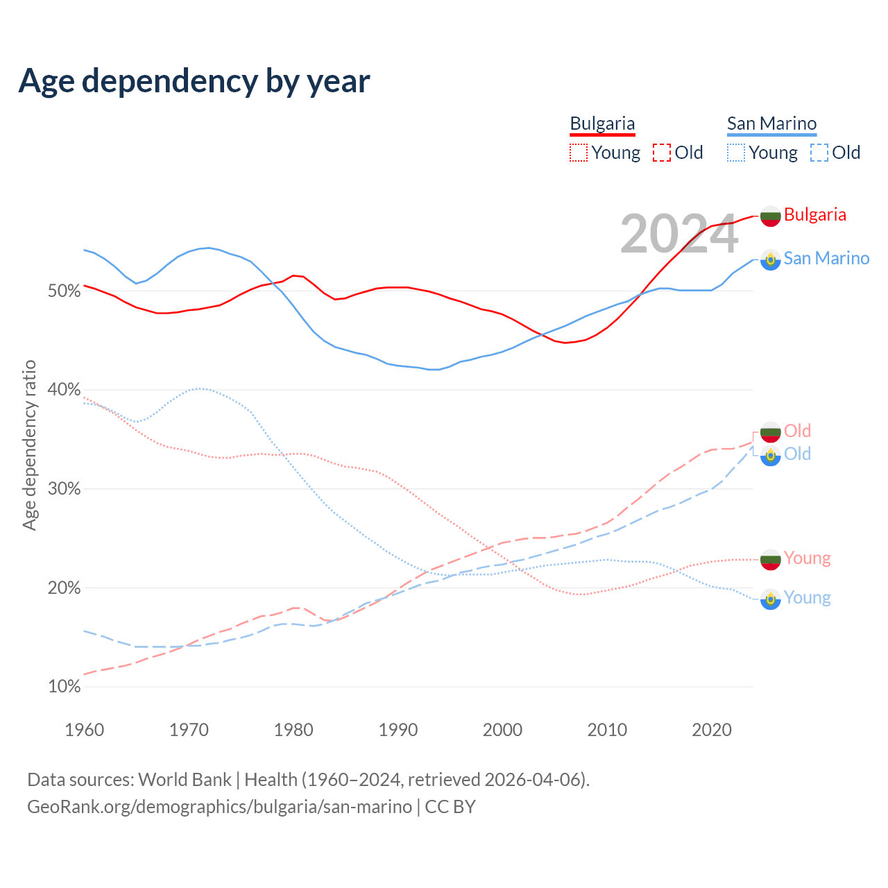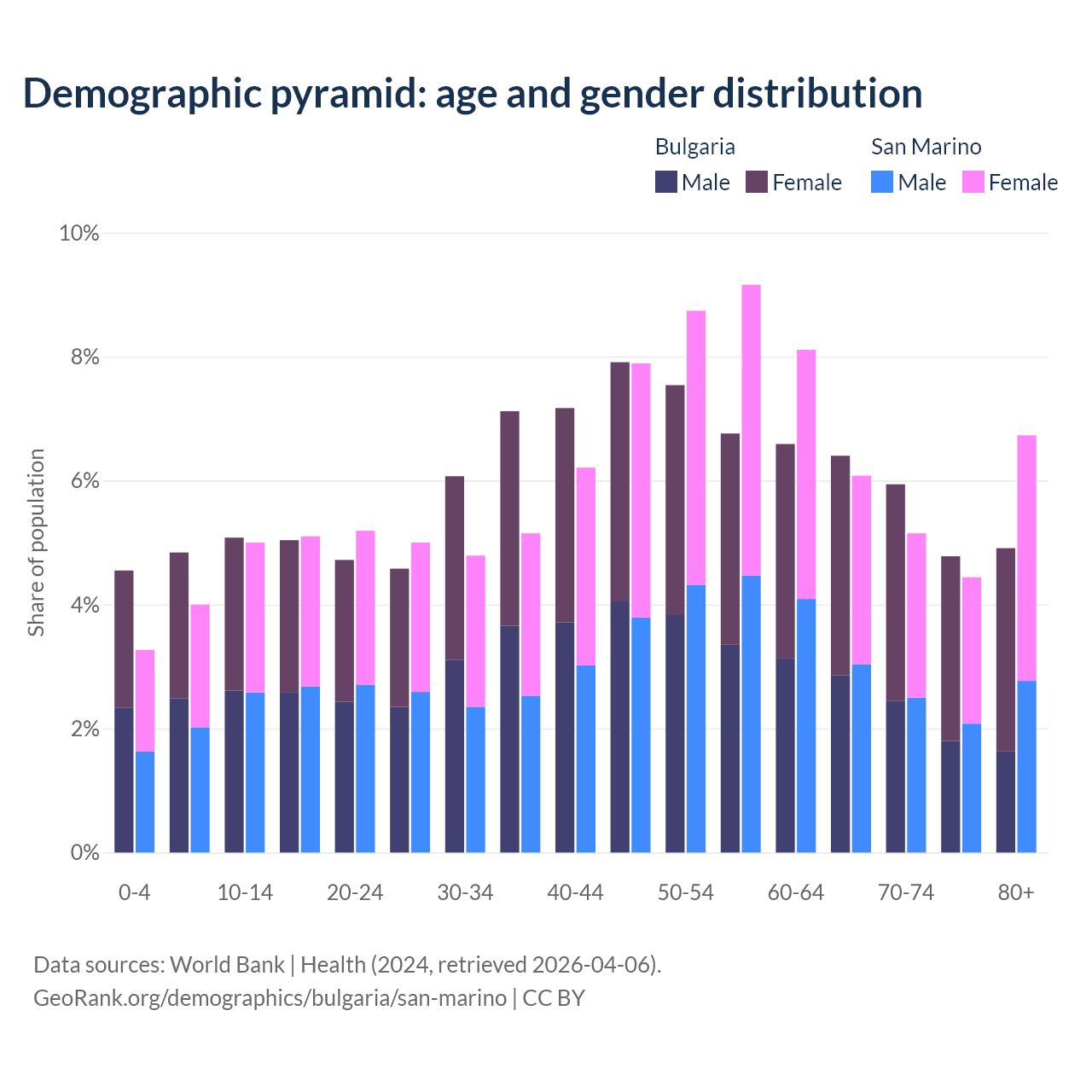 - Bulgaria is ranked 12/196 by median age (oldest to youngest) vs 3/196 for San Marino.