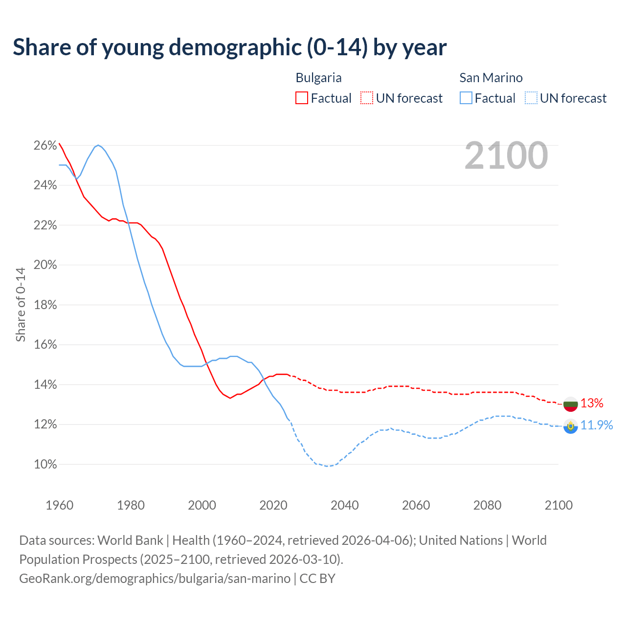 - The share of young demographic (0-15 years old) in Bulgaria is 14.5% vs 12.3% in San Marino.