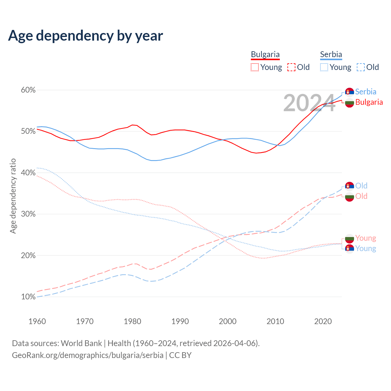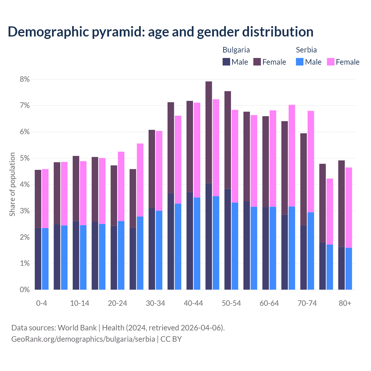 - Bulgaria is ranked 12/196 by median age (oldest to youngest) vs 15/196 for Serbia.