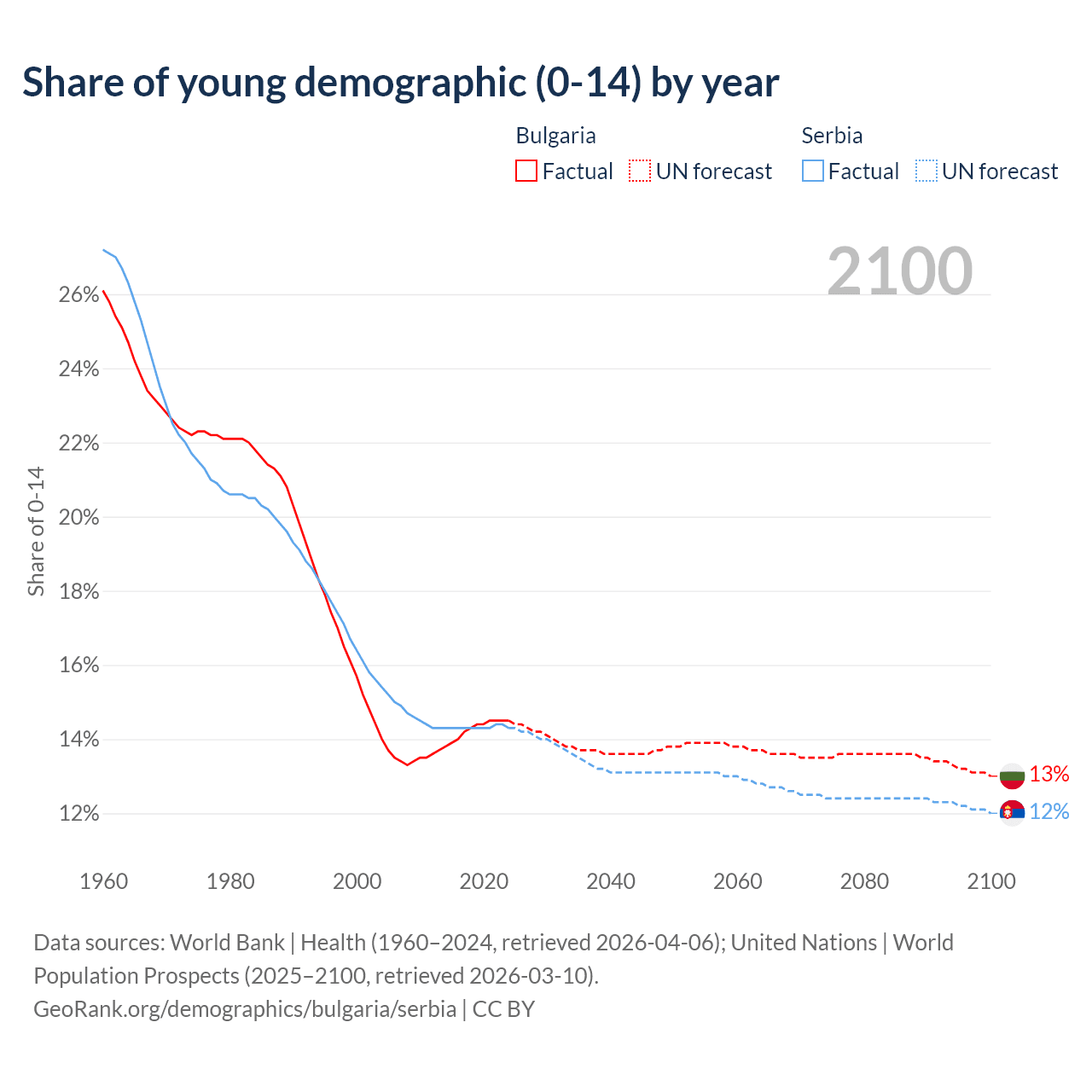 - The share of young demographic (0-15 years old) in Bulgaria is 14.5% vs 14.3% in Serbia.
