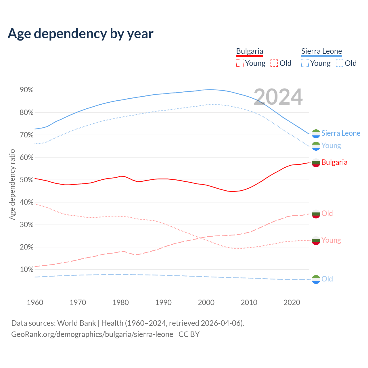 - The share of old-age demographic (65+) in Bulgaria is 22% vs 3.24% in Sierra Leone.
