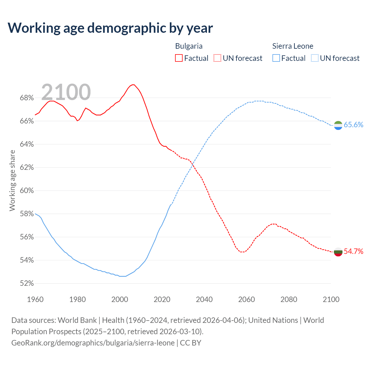 Median age Bulgaria vs Sierra Leone, 1960-2100