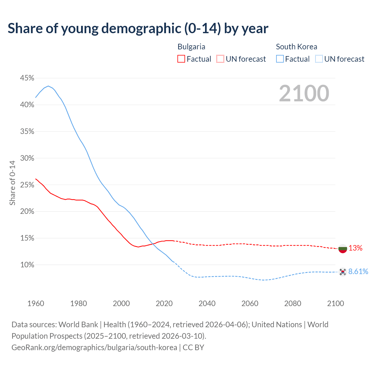 - The share of young demographic (0-15 years old) in Bulgaria is 14.5% vs 10.6% in South Korea.