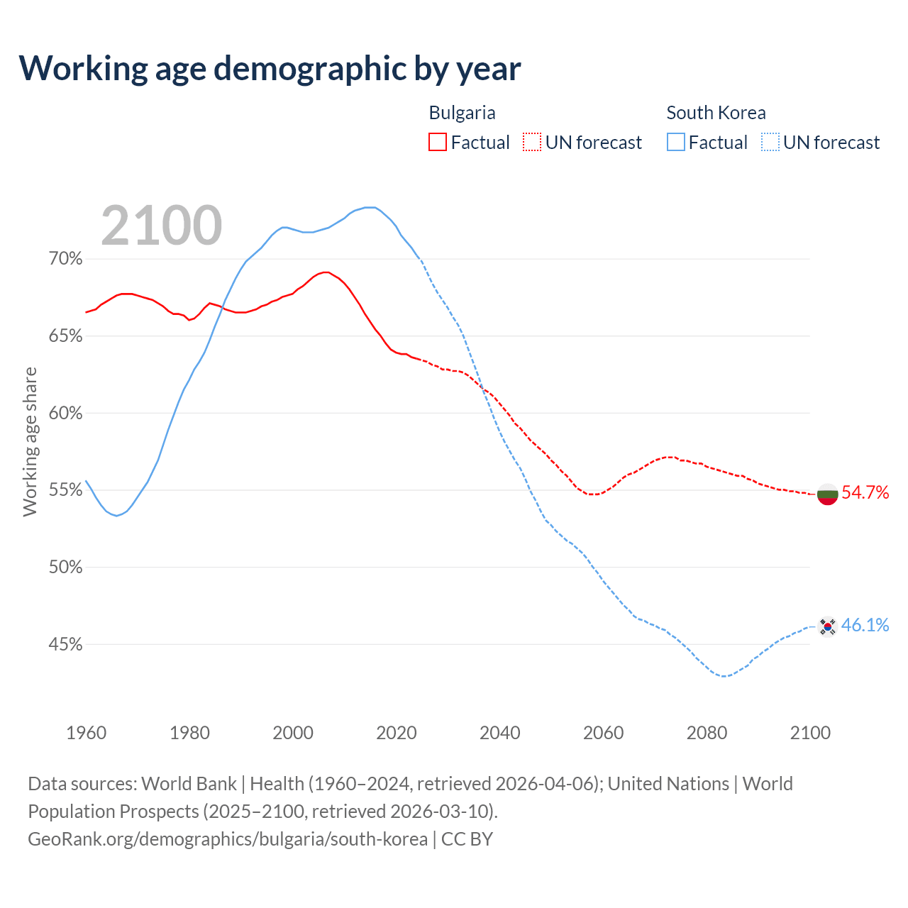 Median age Bulgaria vs South Korea, 1960-2100