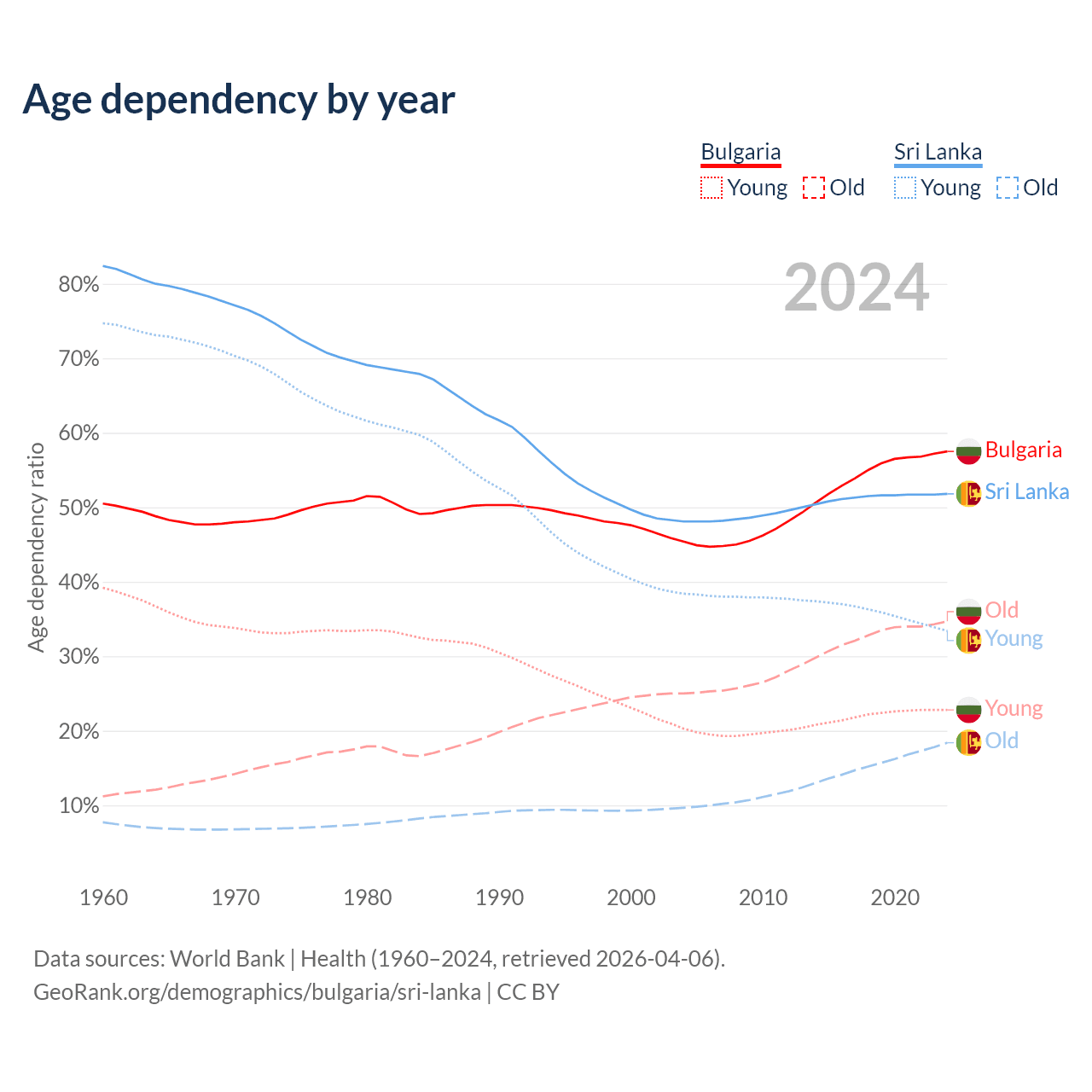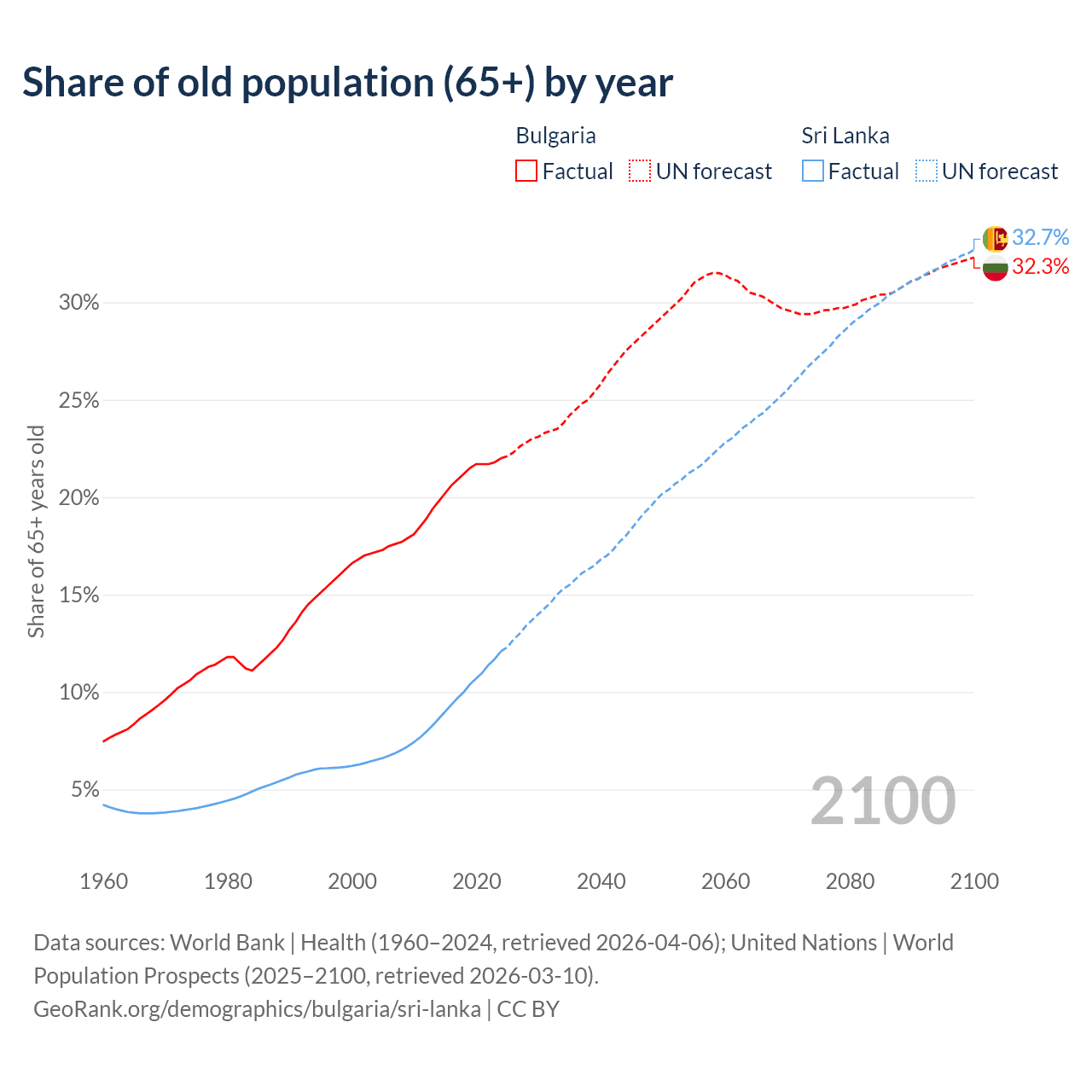 The share of older people aged 65 and over is 22% in Bulgaria and 12.1% in Sri Lanka. Life expectancy in Bulgaria compared to Sri Lanka .