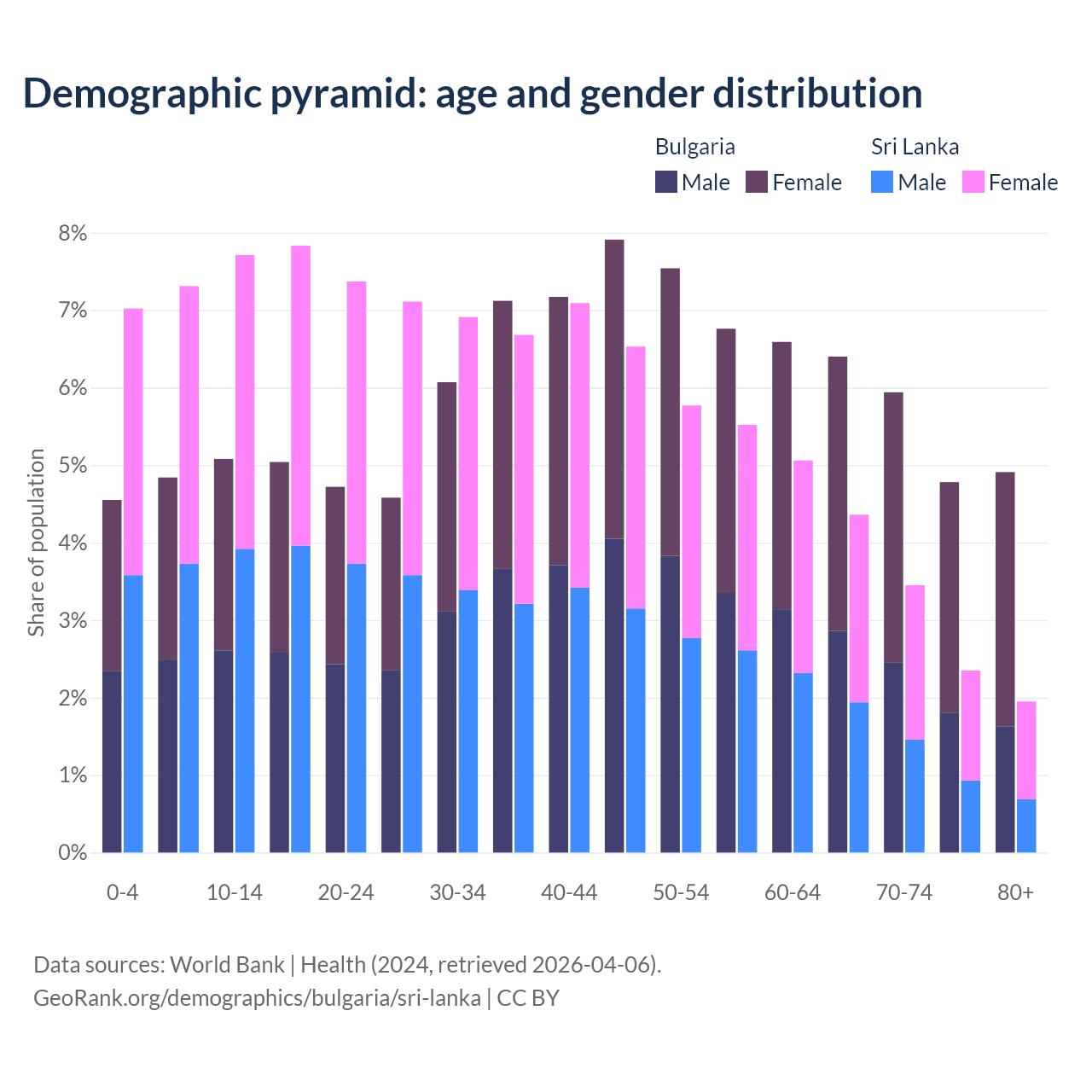 - Bulgaria is ranked 12/196 by median age (oldest to youngest) vs 81/196 for Sri Lanka.