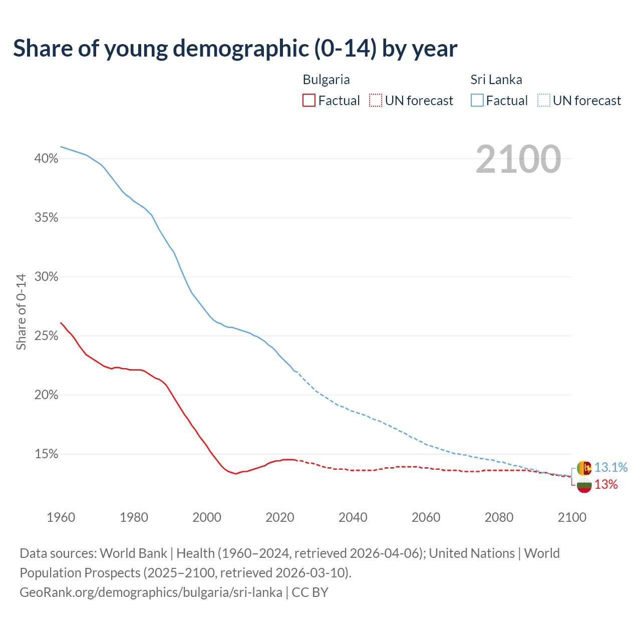 - The share of young demographic (0-15 years old) in Bulgaria is 14.5% vs 22% in Sri Lanka.