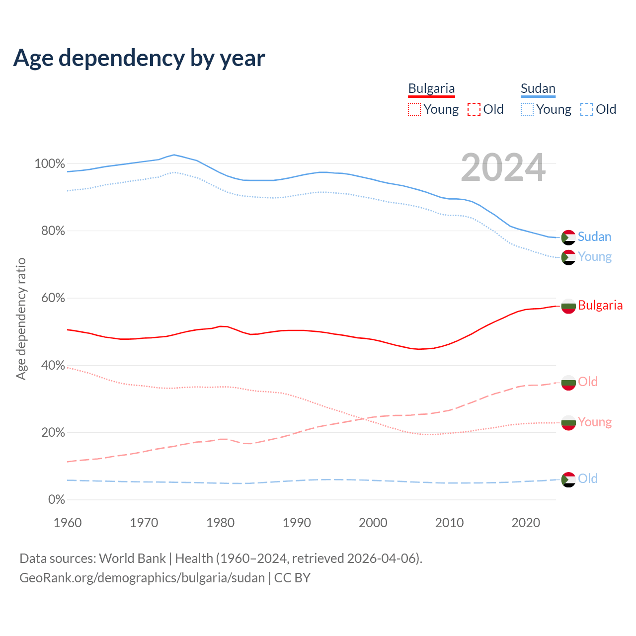 - Bulgaria is ranked 12/196 by median age (oldest to youngest) vs 172/196 for Sudan.