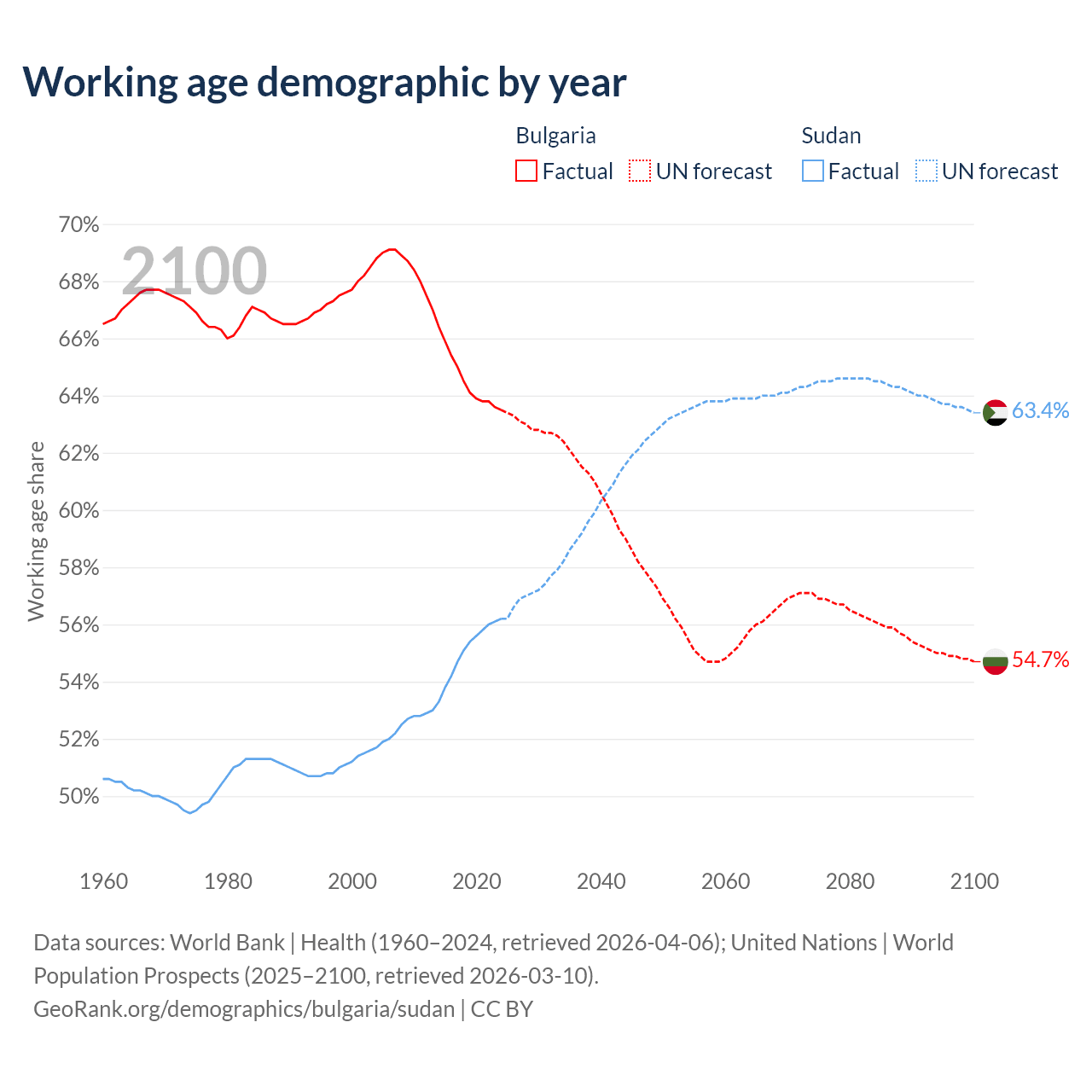 - Bulgaria has 4.04M working age adults (aged 15-64) vs 30M in Sudan.
