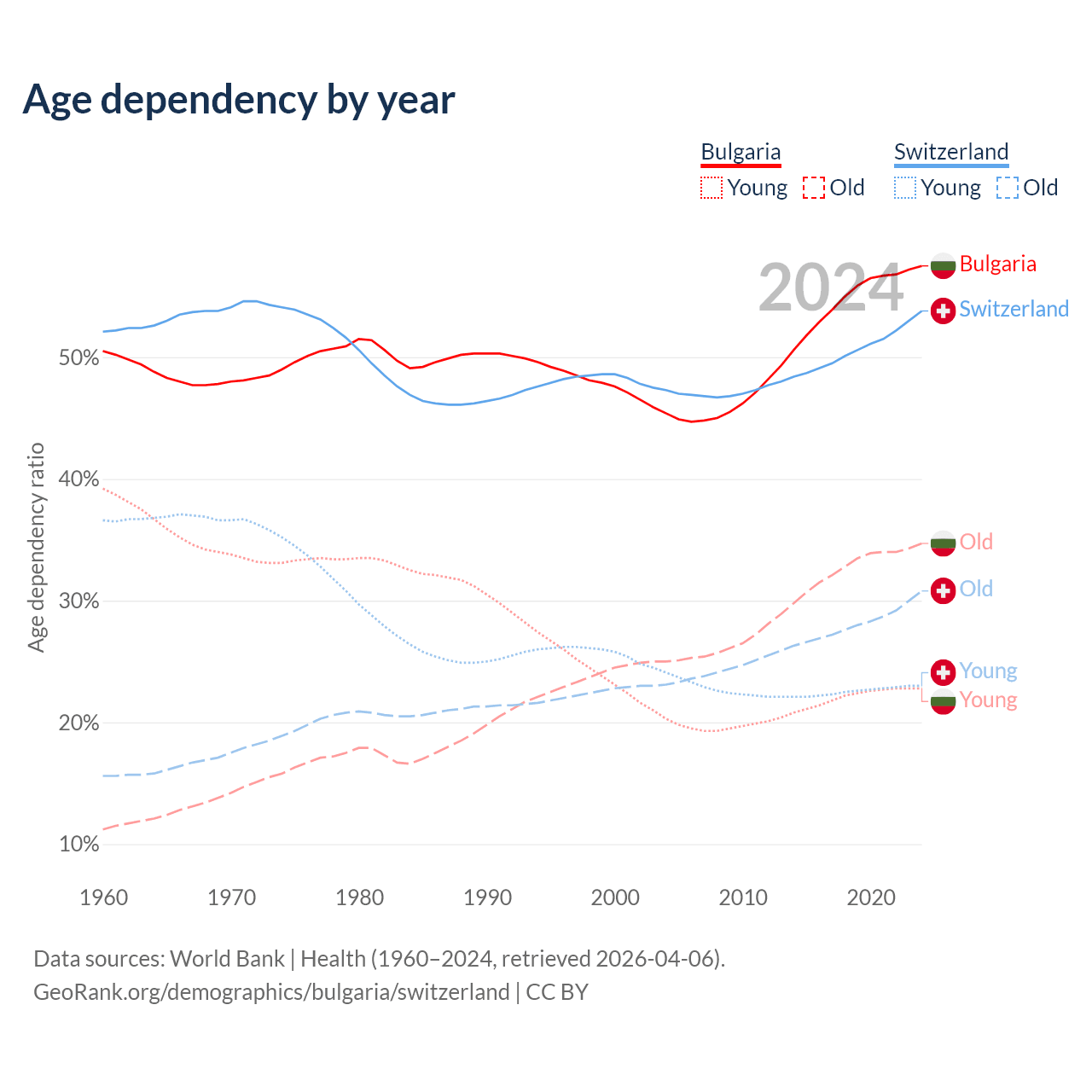 - Bulgaria is ranked 12/196 by median age (oldest to youngest) vs 24/196 for Switzerland.