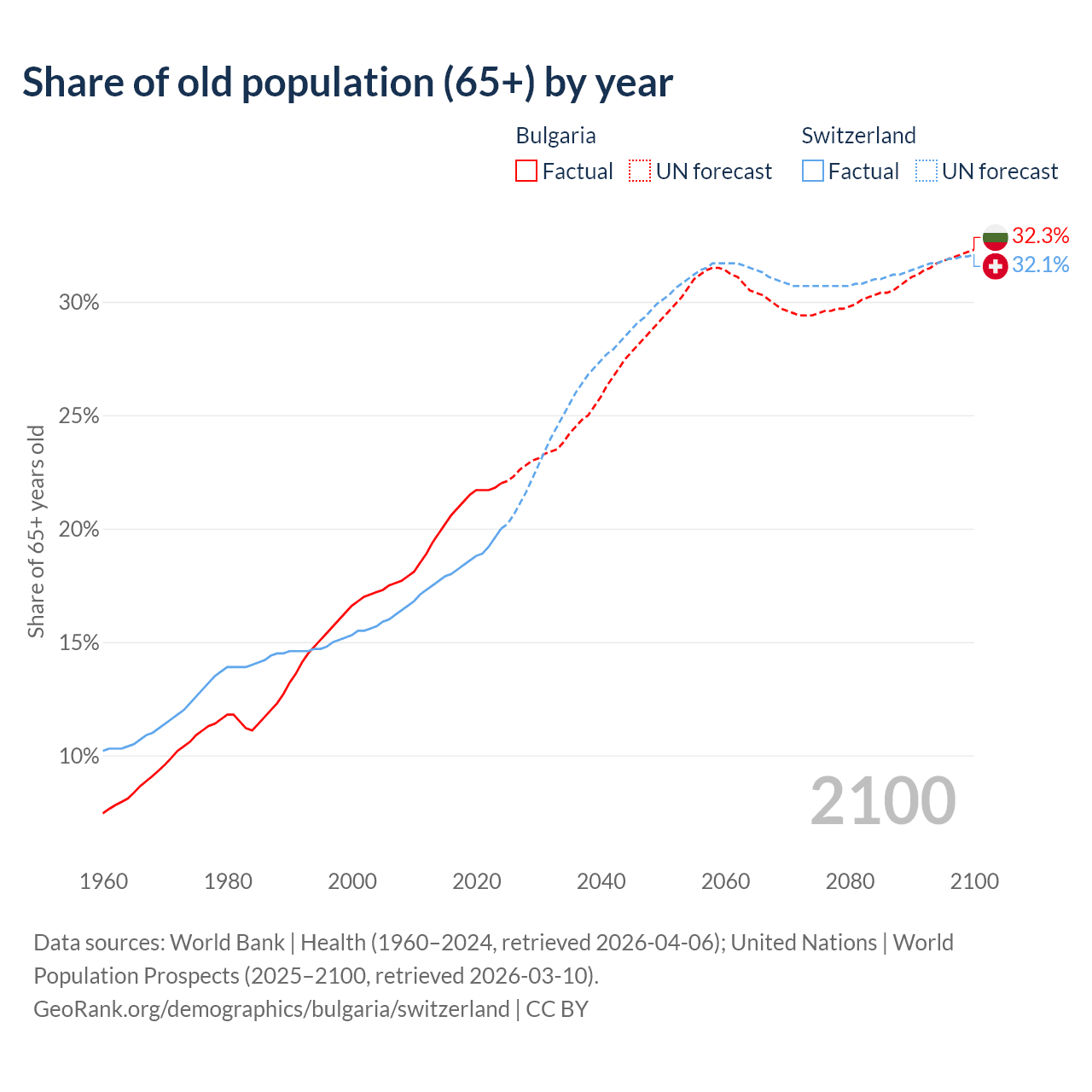 The share of older people aged 65 and over is 22% in Bulgaria and 20% in Switzerland. Life expectancy in Bulgaria compared to Switzerland .