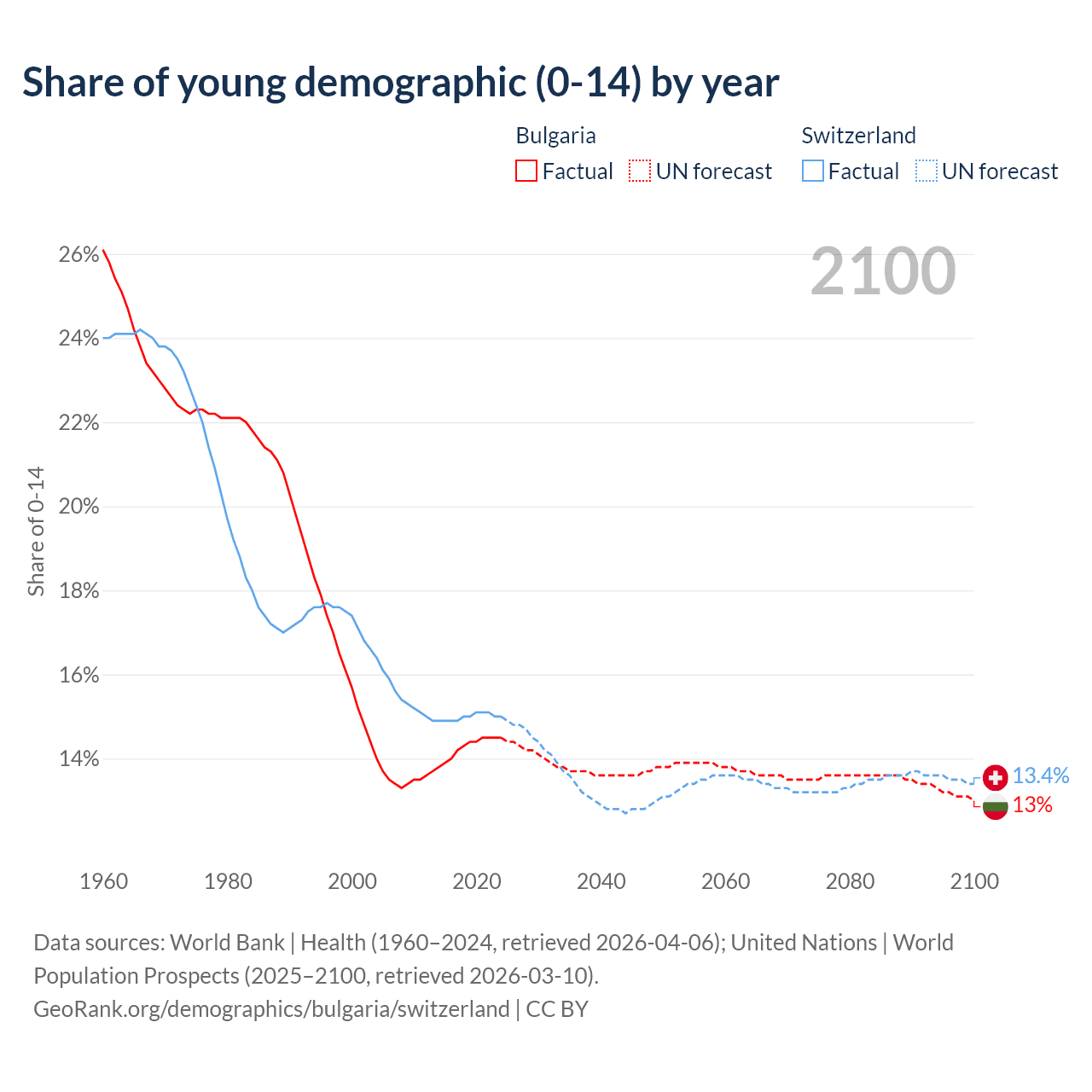 - The share of young demographic (0-15 years old) in Bulgaria is 14.5% vs 15% in Switzerland.