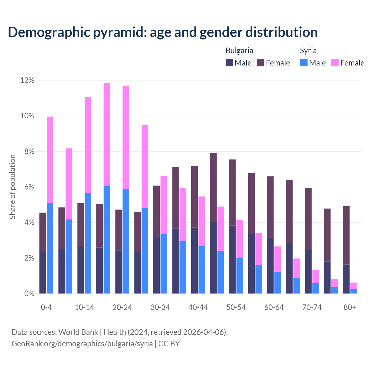 - As of 2026, the population of Bulgaria is 6.36M vs 26.8M in Syria - 4.22 times difference.