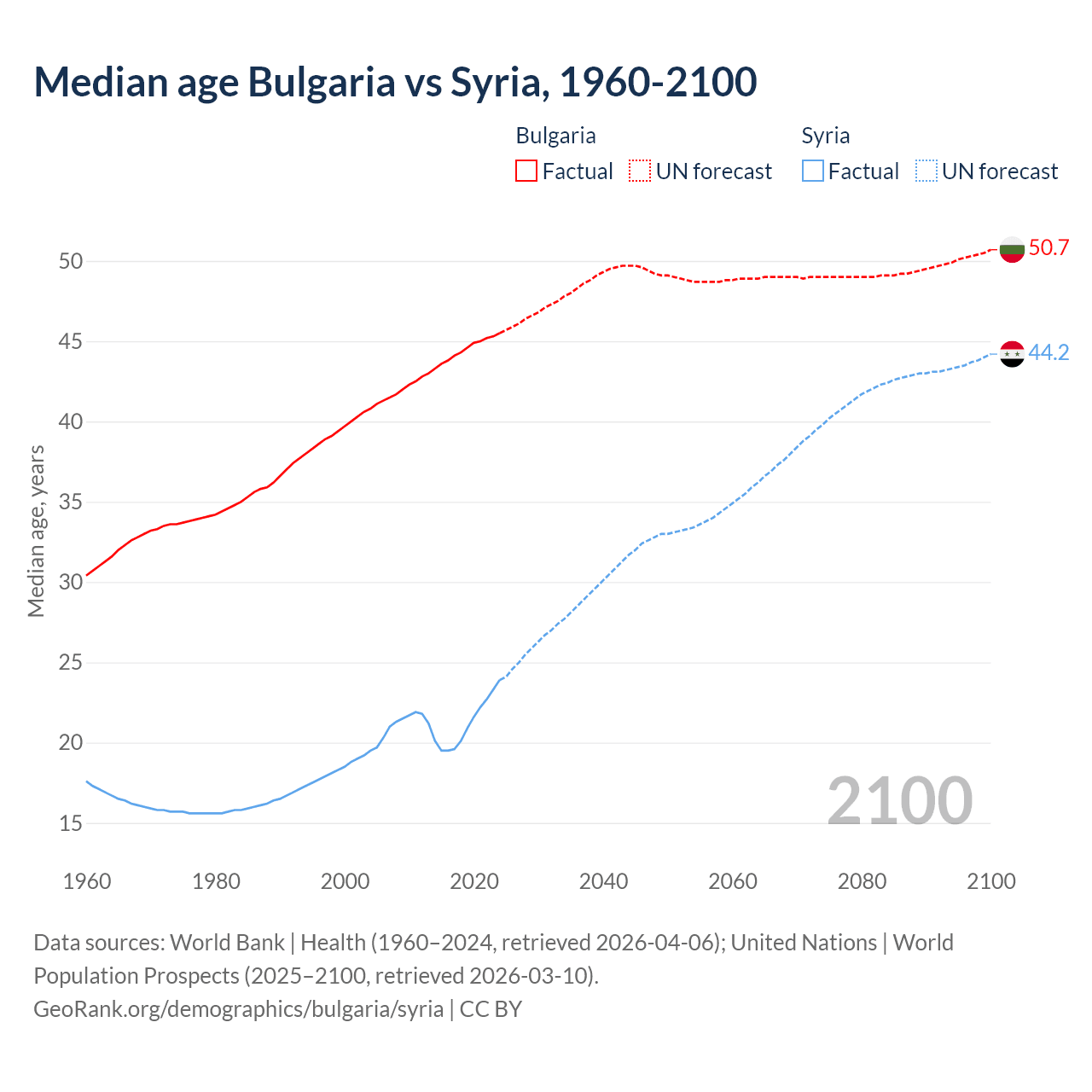 - Bulgaria is ranked 12/196 by median age (oldest to youngest) vs 138/196 for Syria.