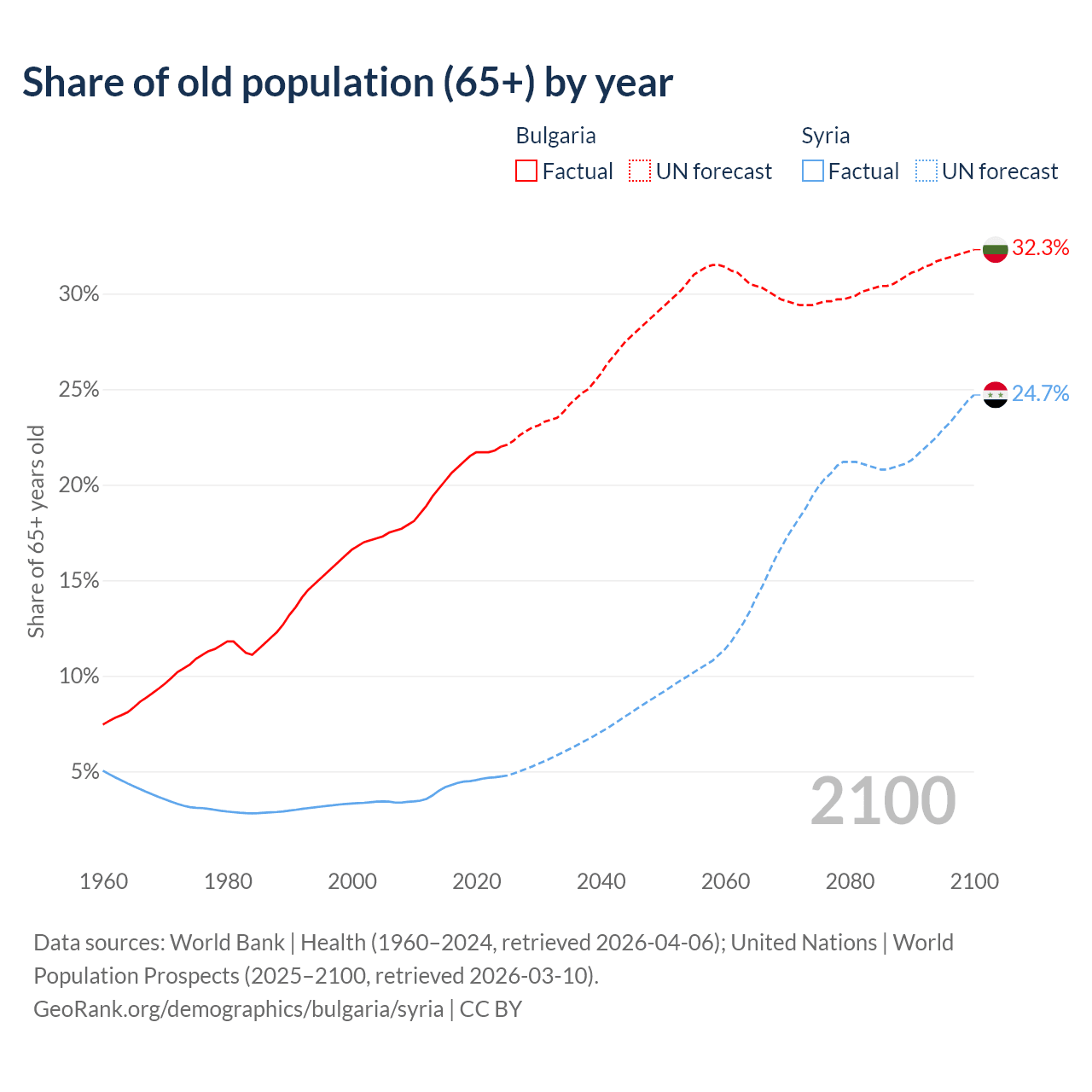 - The share of old-age demographic (65+) in Bulgaria is 22% vs 4.74% in Syria.