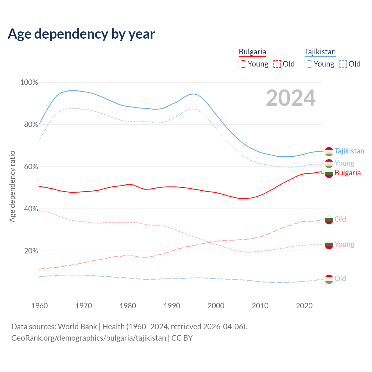 Data sources: World Bank | Health (1960–2024, retrieved 2026-04-06); U.S. Census Bureau (1960–2024, retrieved 2026-02-08).