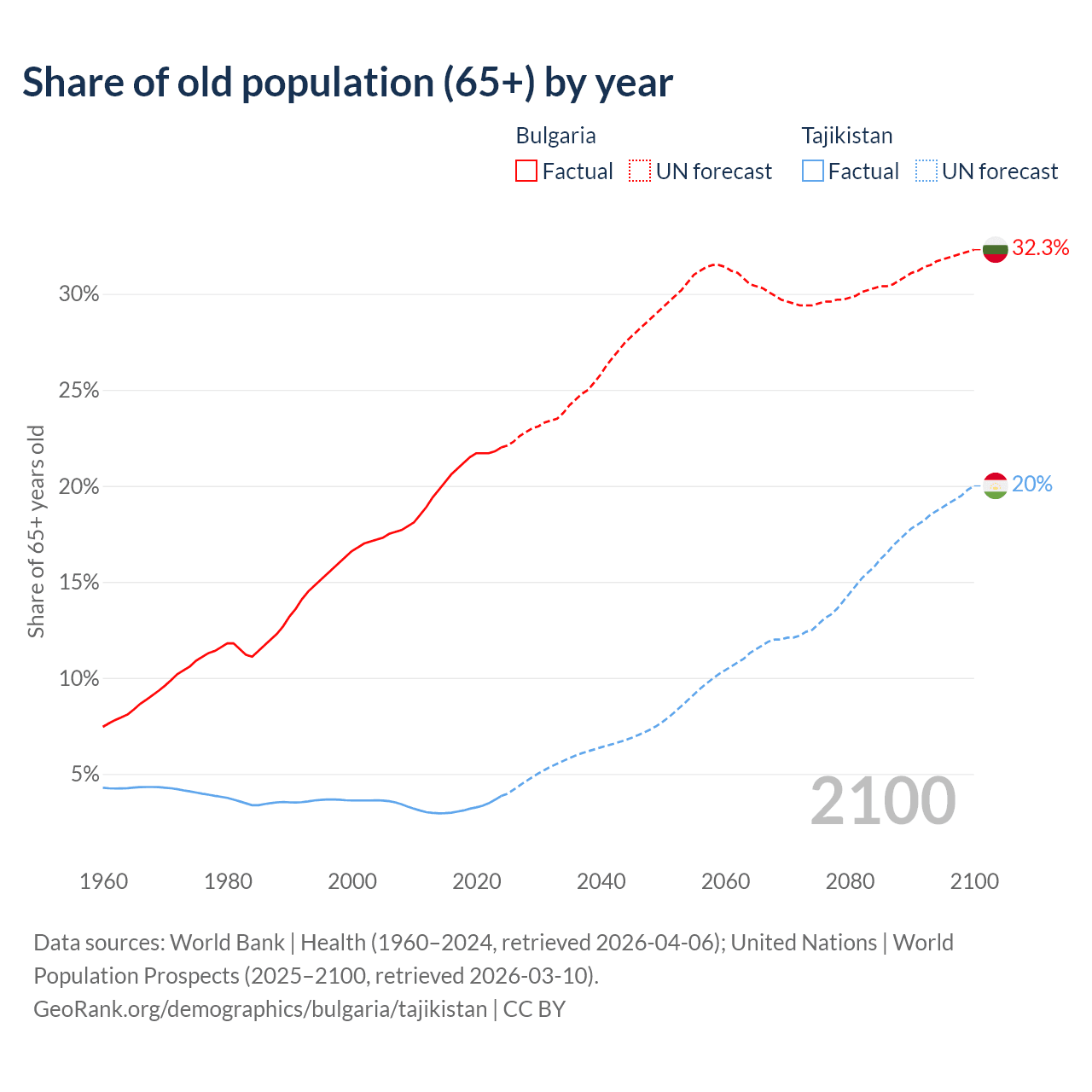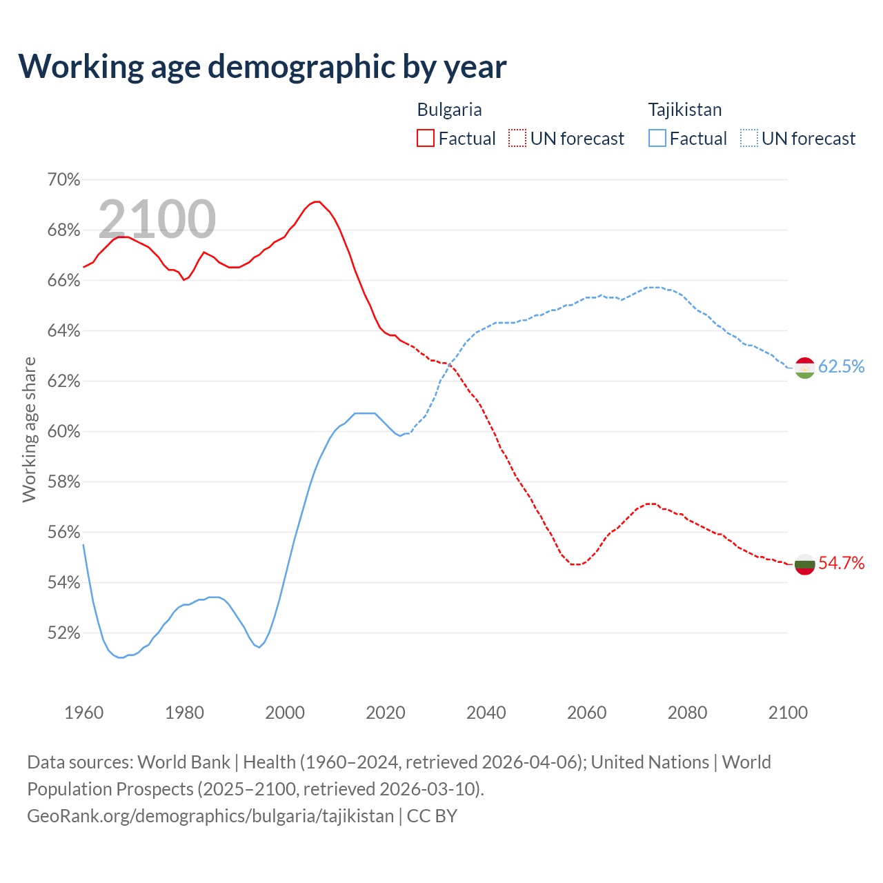 Median age Bulgaria vs Tajikistan, 1960-2100