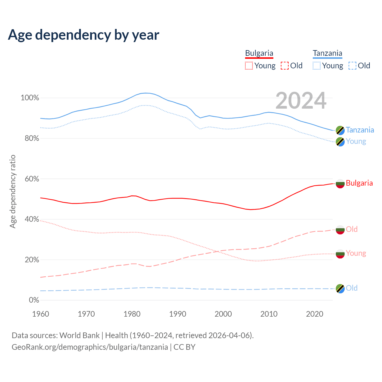 Data sources: World Bank | Health (1960–2024, retrieved 2026-04-06); U.S. Census Bureau (1960–2024, retrieved 2026-02-08).