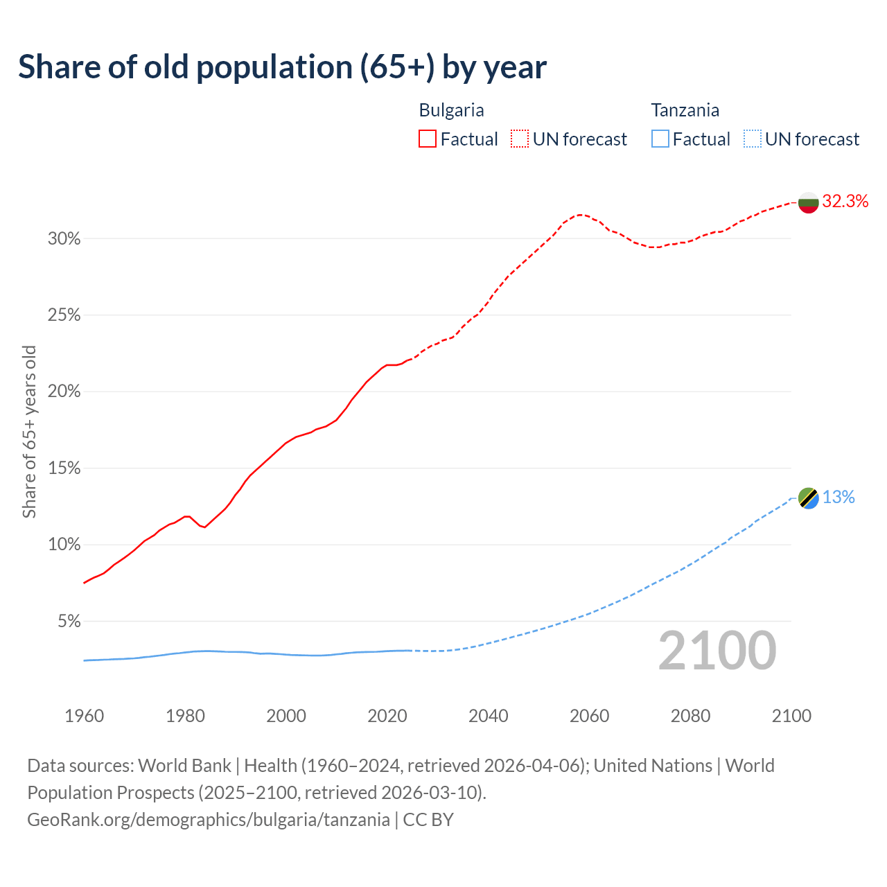 The share of older people aged 65 and over is 22% in Bulgaria and 3.05% in Tanzania. Life expectancy in Bulgaria compared to Tanzania .