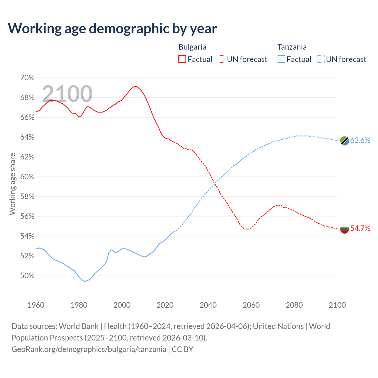 Median age Bulgaria vs Tanzania, 1960-2100