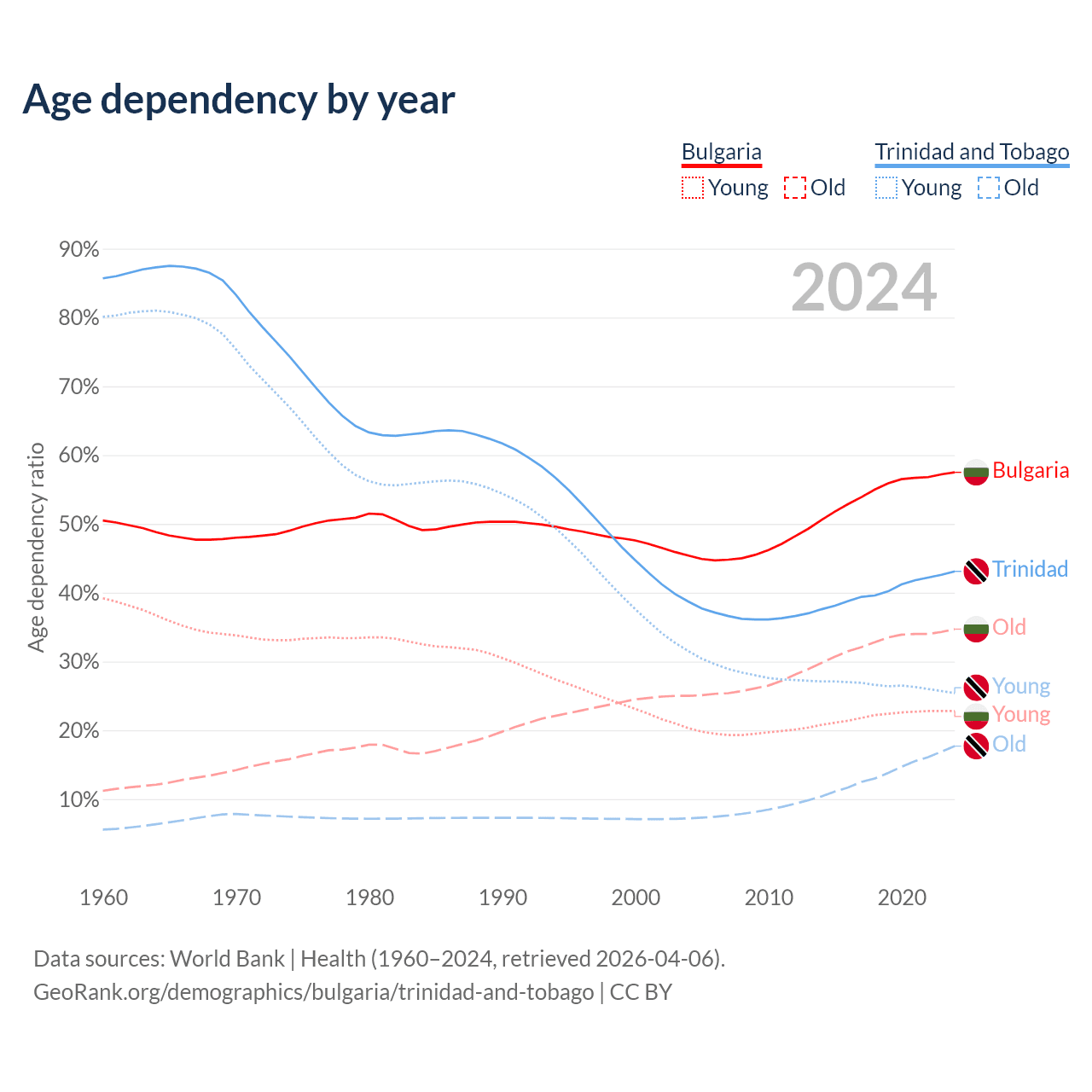 - The share of old-age demographic (65+) in Bulgaria is 22% vs 12.4% in Trinidad and Tobago.