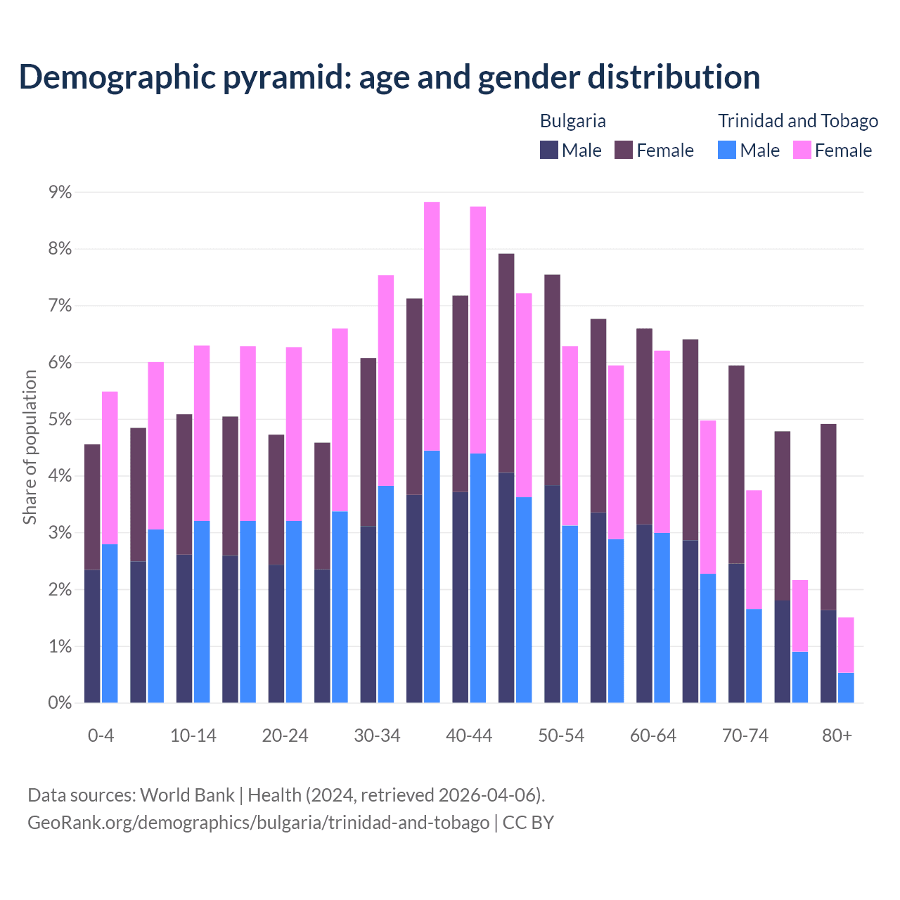 - Bulgaria is ranked 12/196 by median age (oldest to youngest) vs 58/196 for Trinidad and Tobago.