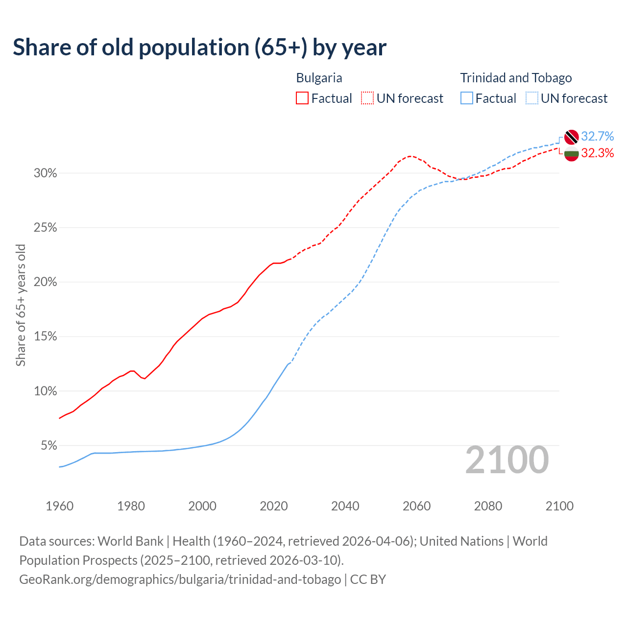 The share of older people aged 65 and over is 22% in Bulgaria and 12.4% in Trinidad and Tobago. Life expectancy in Bulgaria compared to Trinidad and Tobago .