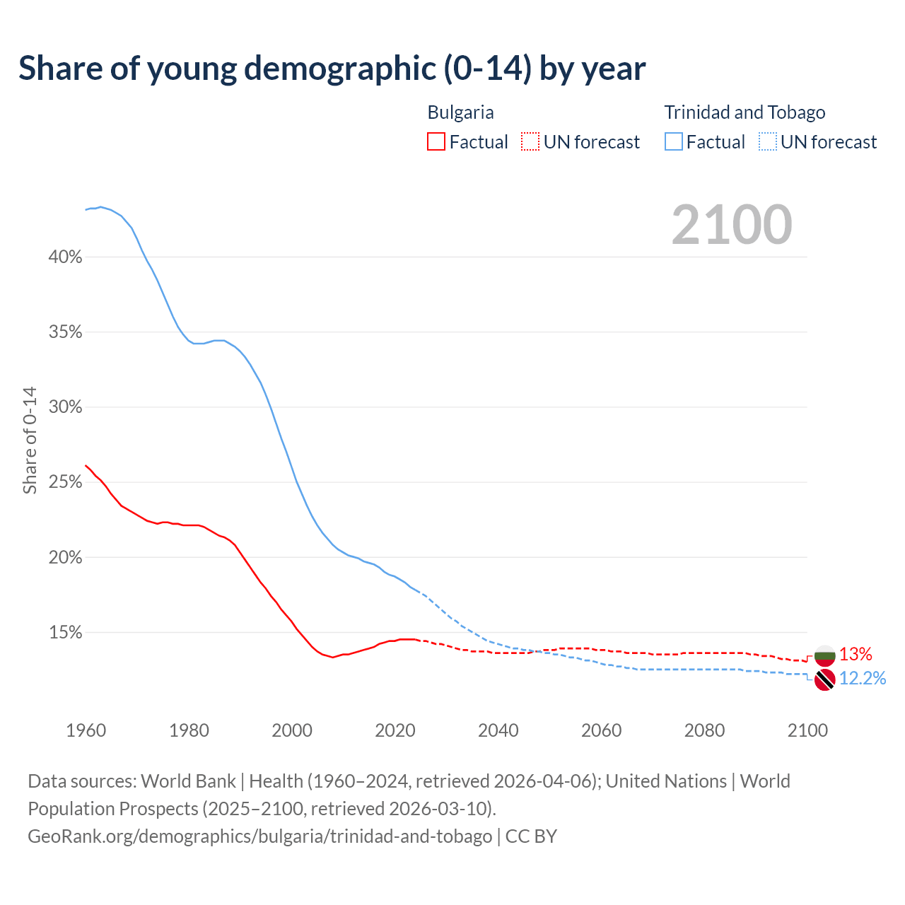 - The share of young demographic (0-15 years old) in Bulgaria is 14.5% vs 17.8% in Trinidad and Tobago.