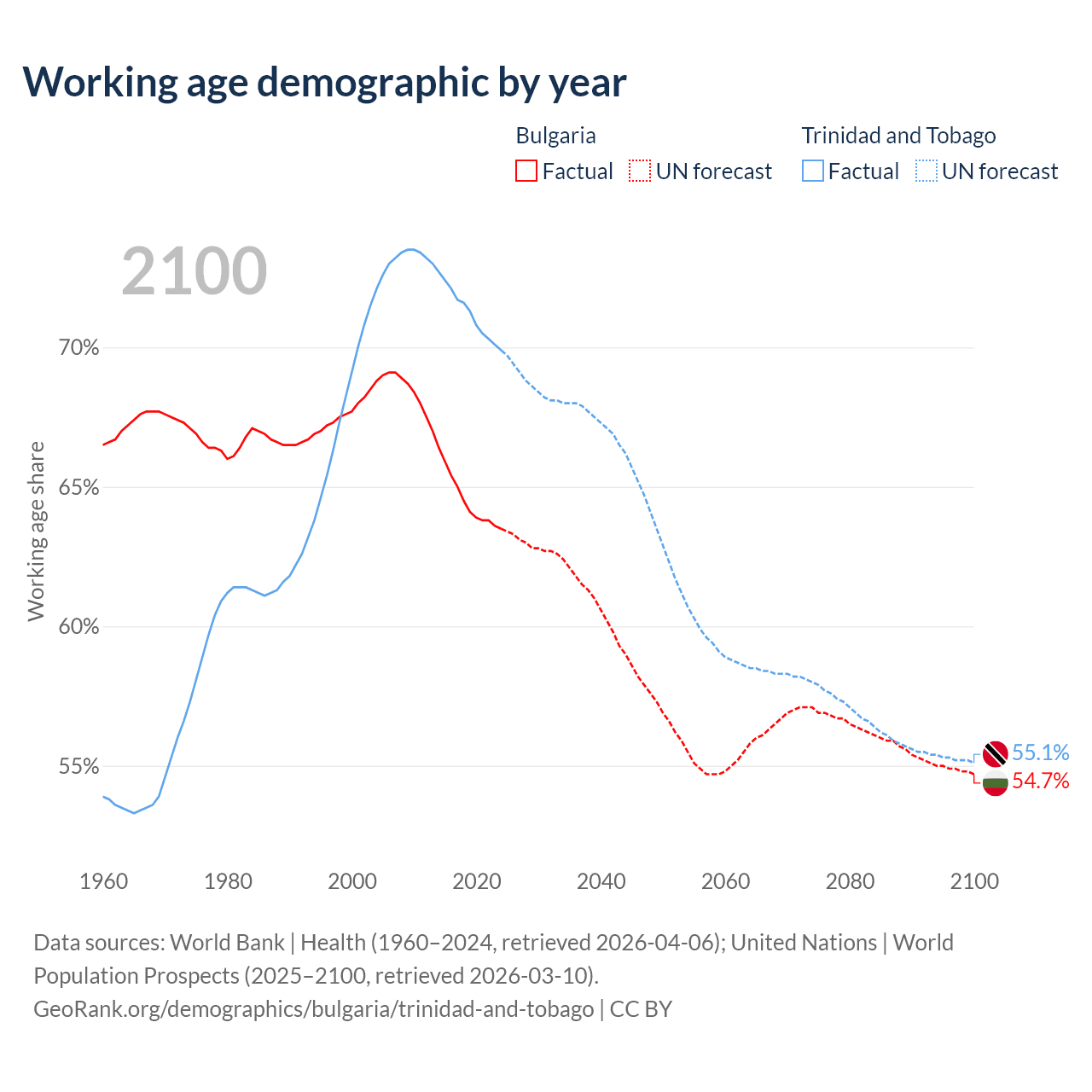 - Bulgaria has 4.04M working age adults (aged 15-64) vs 960K in Trinidad and Tobago.