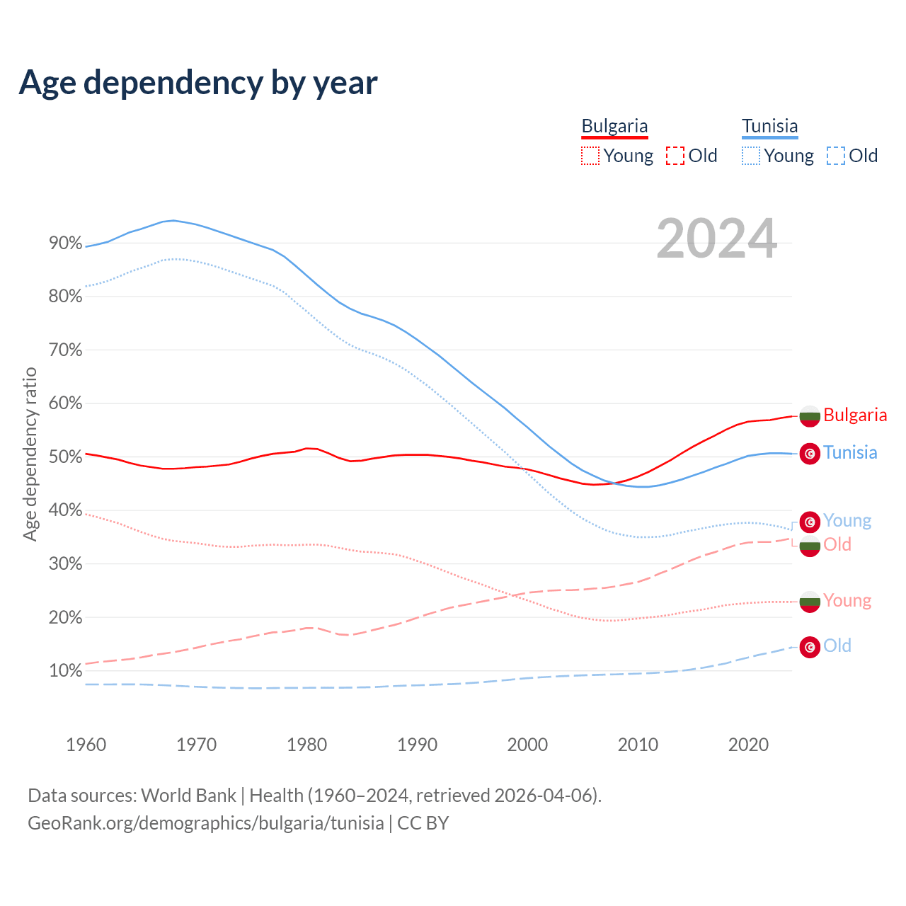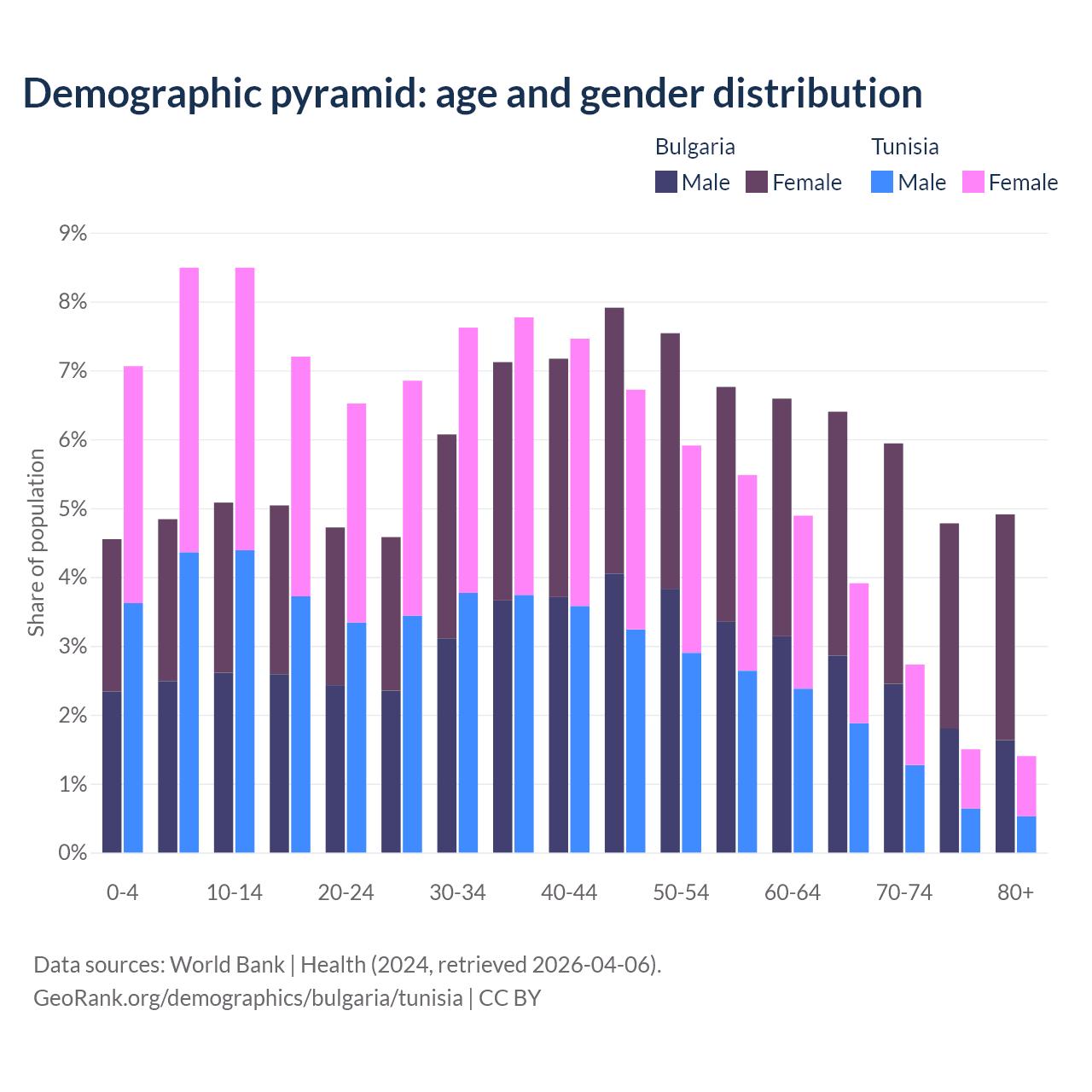 - Bulgaria is ranked 12/196 by median age (oldest to youngest) vs 86/196 for Tunisia.