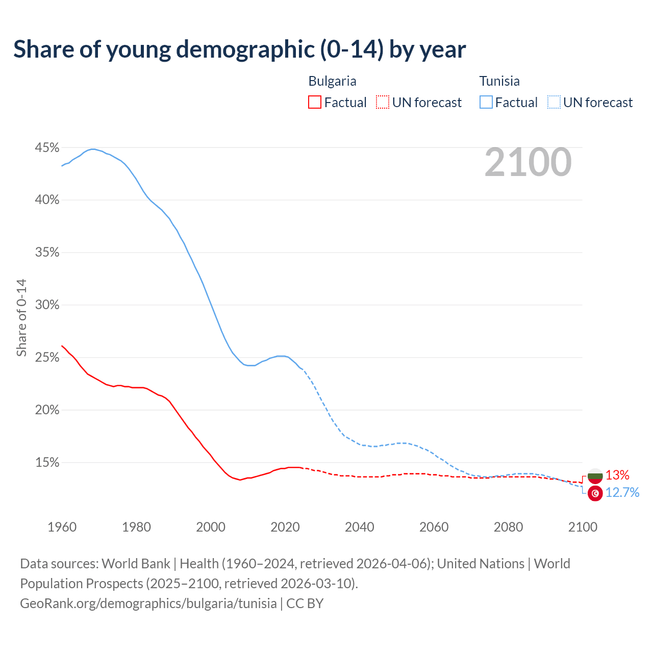 - The share of young demographic (0-15 years old) in Bulgaria is 14.5% vs 24% in Tunisia.
