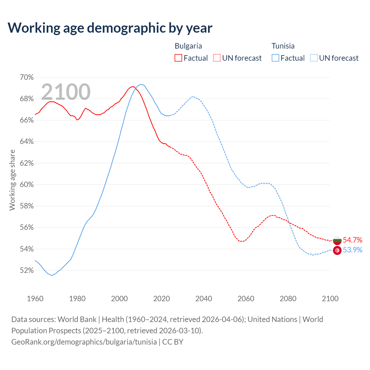 - Bulgaria has 4.04M working age adults (aged 15-64) vs 8.26M in Tunisia.