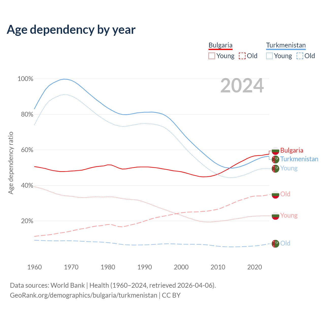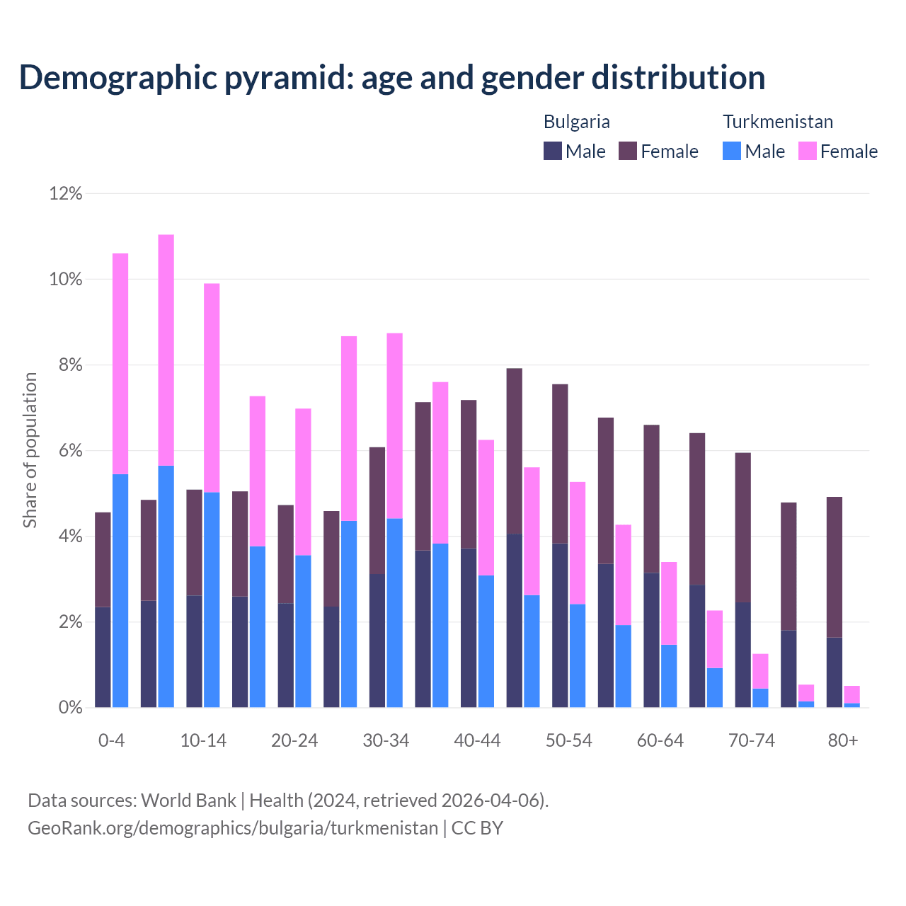 - Bulgaria is ranked 12/196 by median age (oldest to youngest) vs 119/196 for Turkmenistan.